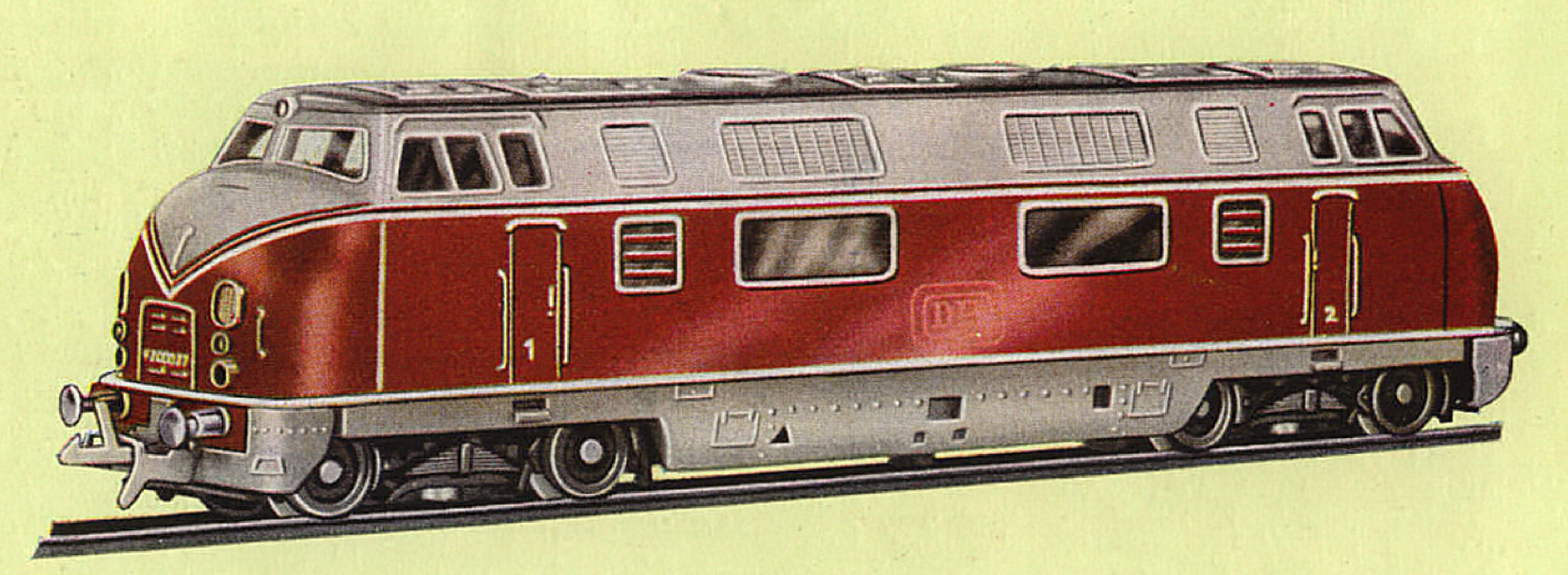 | dieselová lokomotiva červená-světle šedá s tmavě šedým rámem |