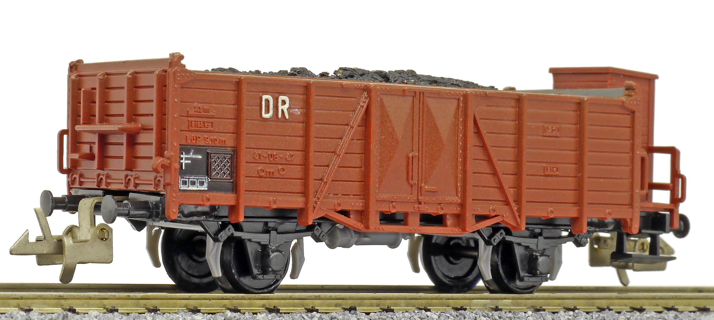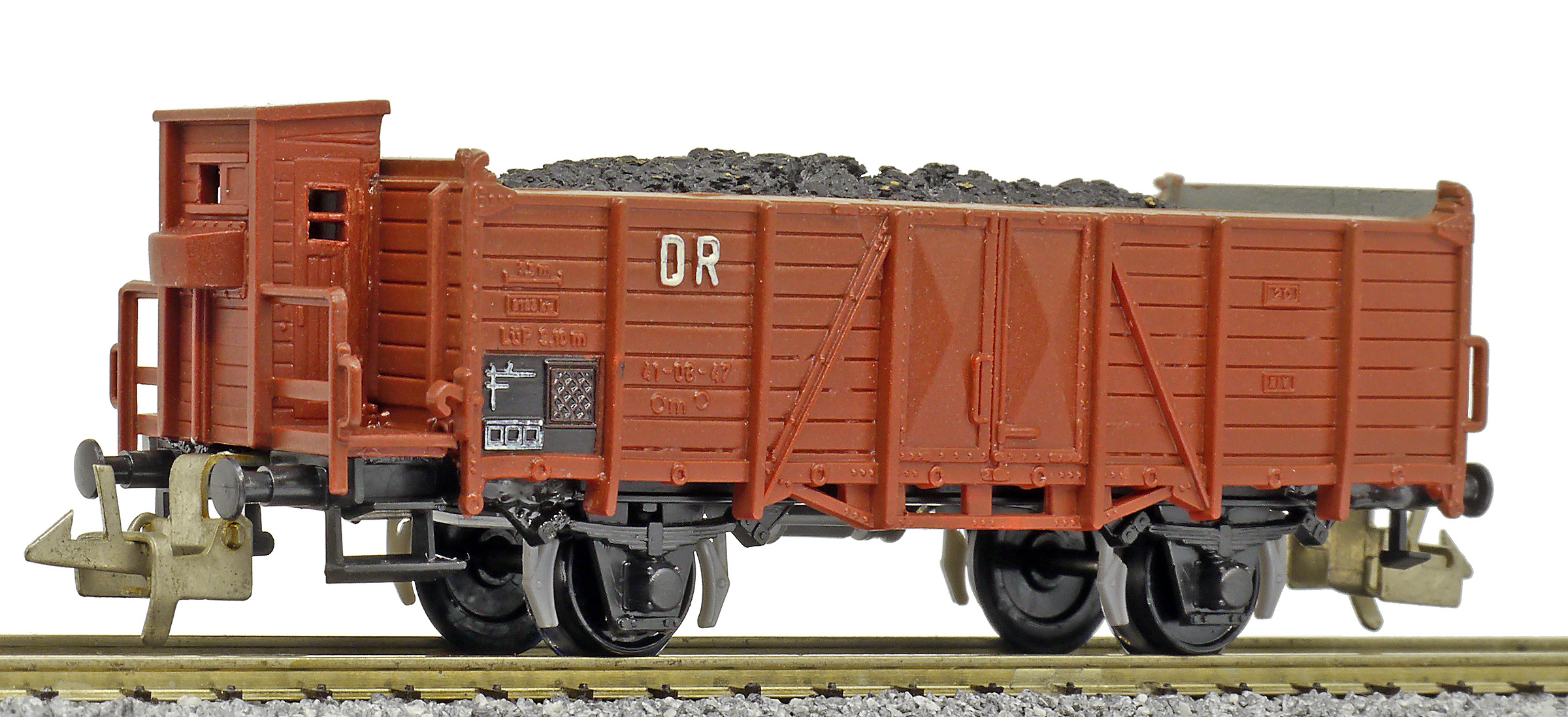 | otevřený nákladní vůz červenohnědý s brzdařskou budkou ložený uhlím |