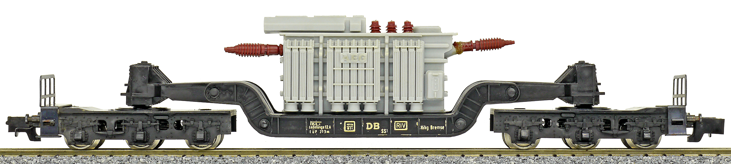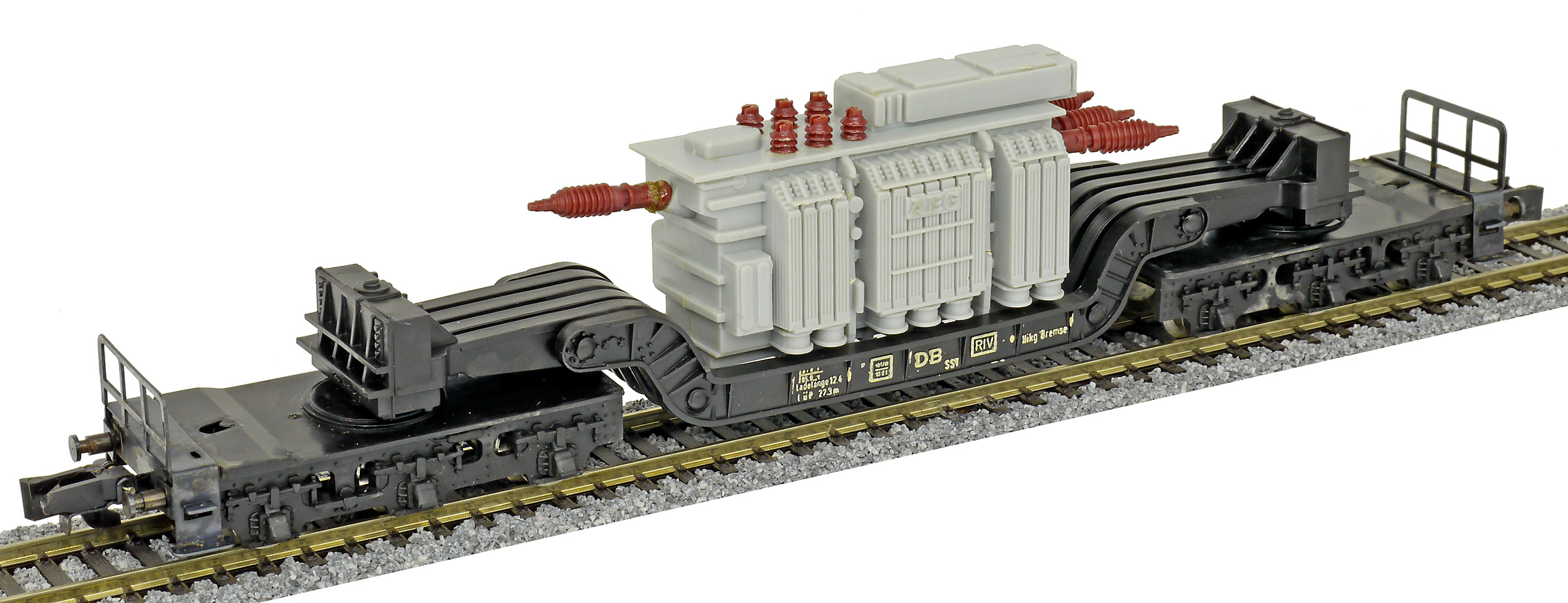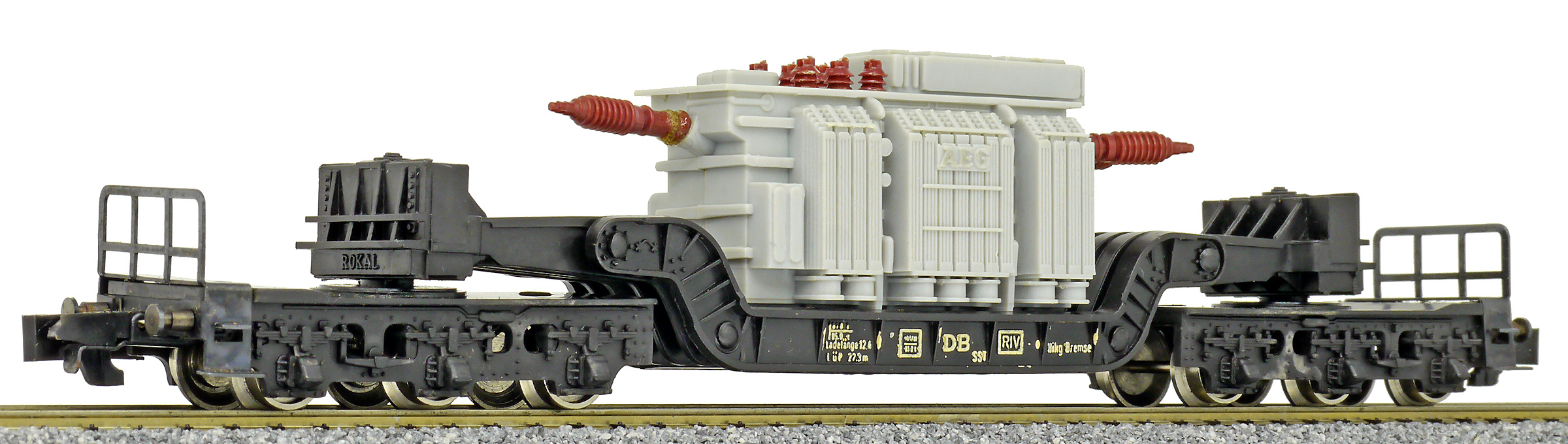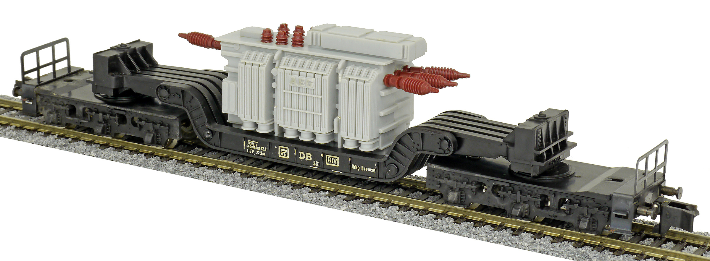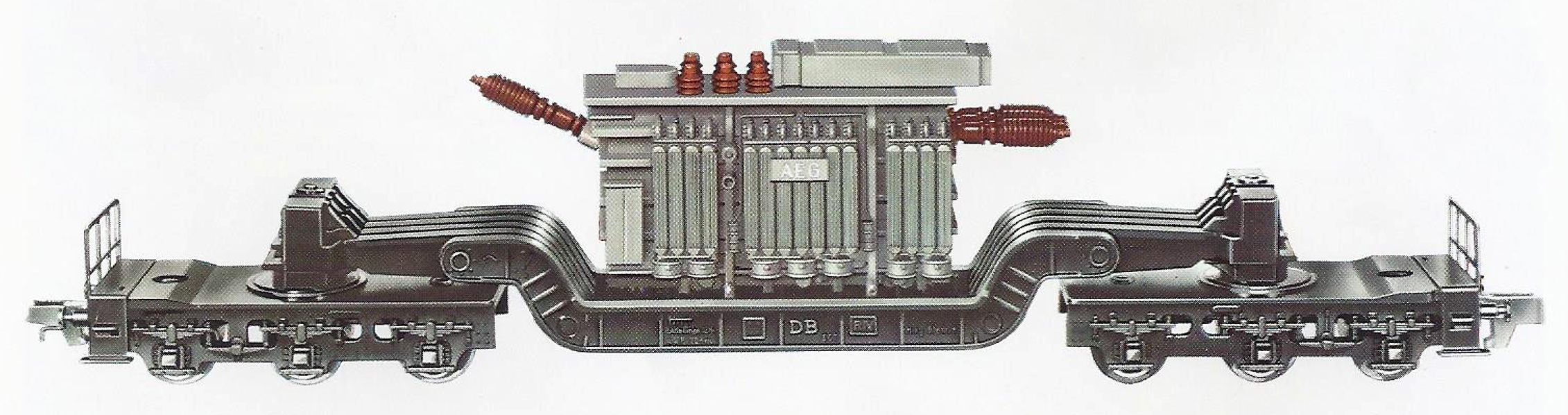 | nákladní hlubinový vůz černý ložený transformátorem „AEG“ |