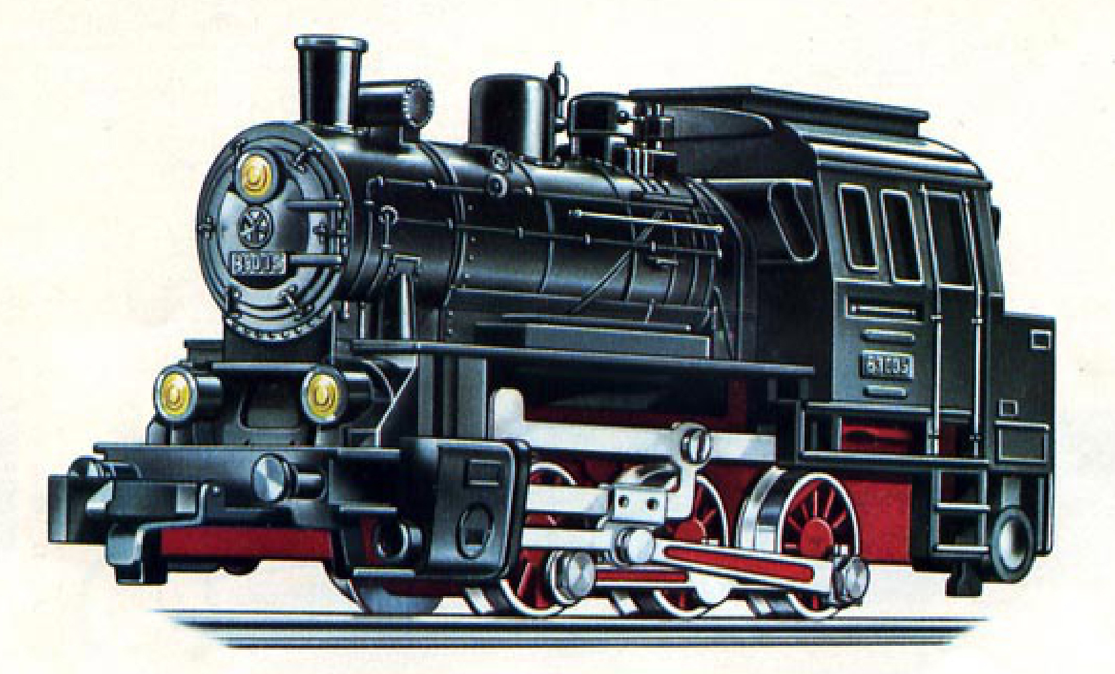 parní lokomotiva černá s červeným pojezdem