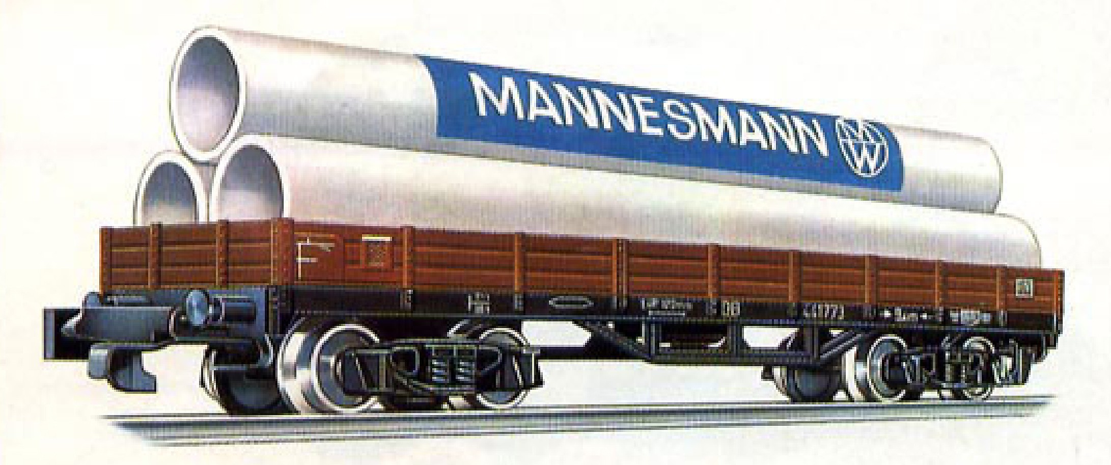 nízkostěnný nákladní vůz červenohnědý s černým rámem s nákladem rour „MANNESMANN“