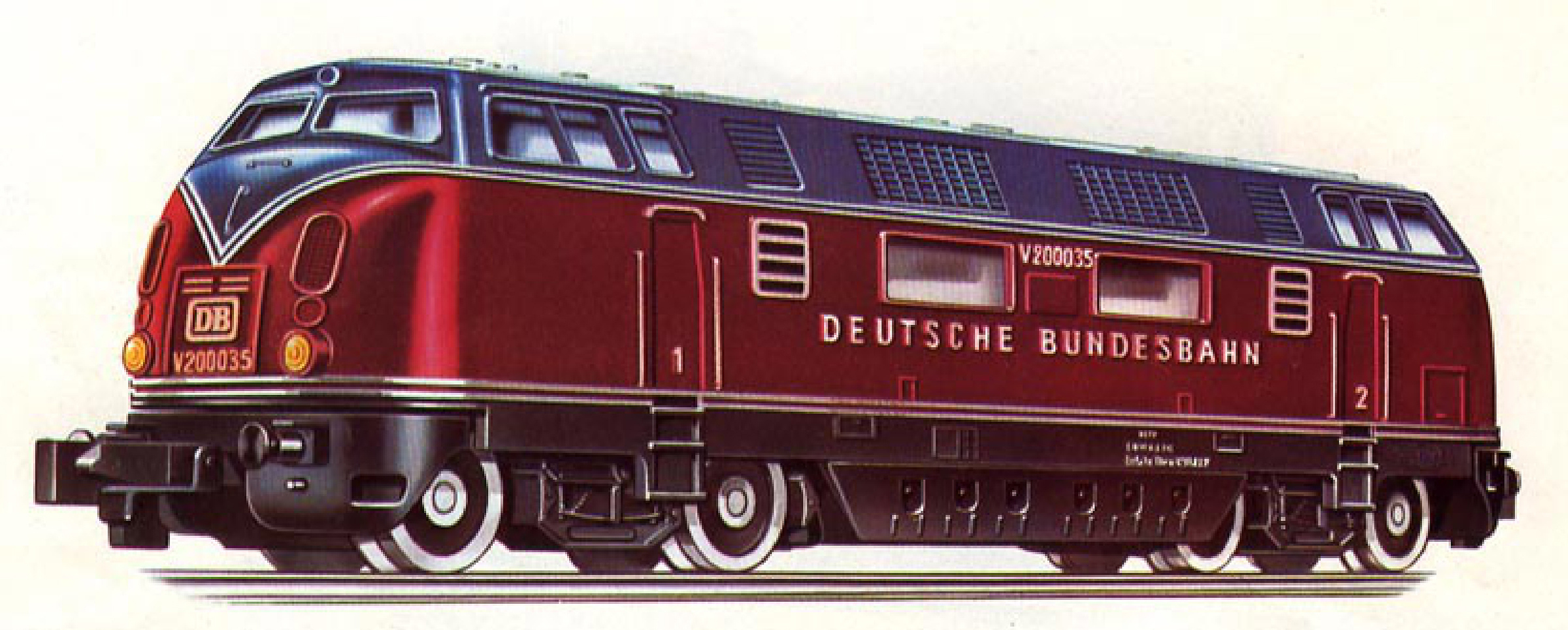 | dieselová lokomotiva červená-tmavě šedá s plastickým nápisem „DEUTSCHE BUNDESBAHN“ |