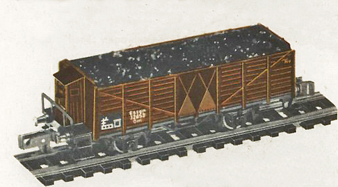 otevřený nákladní vůz červenohnědý s brzdařskou budkou ložený uhlím