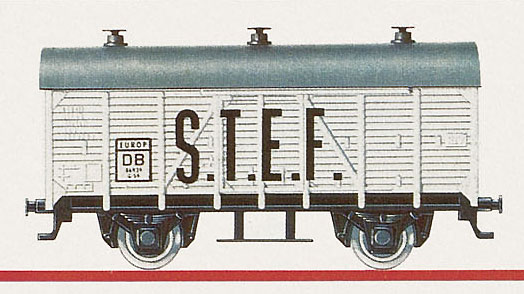| nákladní chladící vůz bílý s tmavě šedou střechou „S.T.E.F.“ |