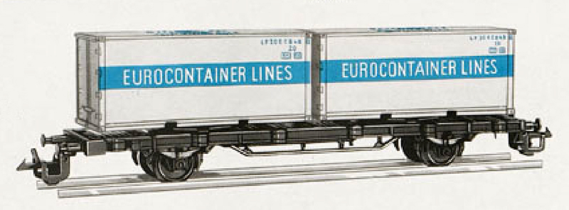 | nákladní plošinový vůz černý se dvěma 20' kontejnery „EUROCONTAINER LINES“ |