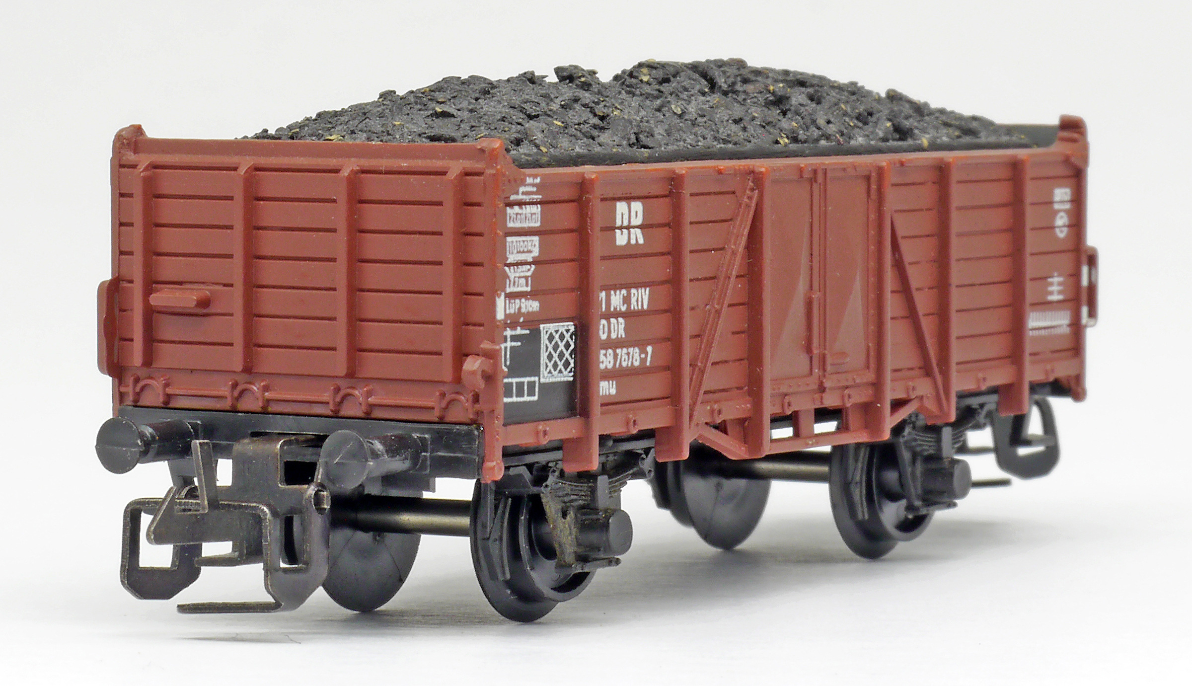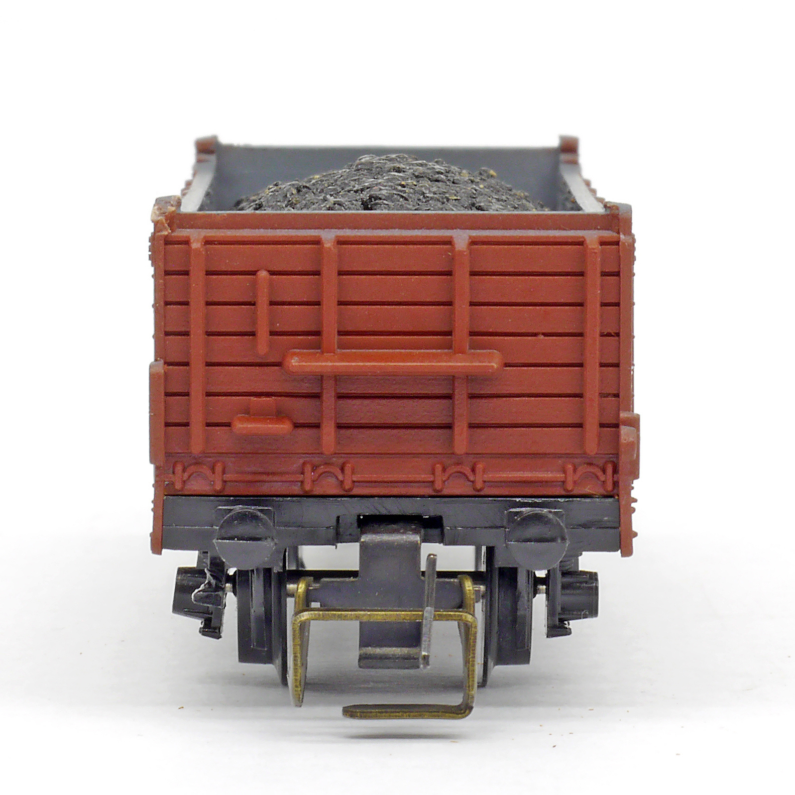 | otevřený nákladní vůz červenohnědý s nákladem uhlí |