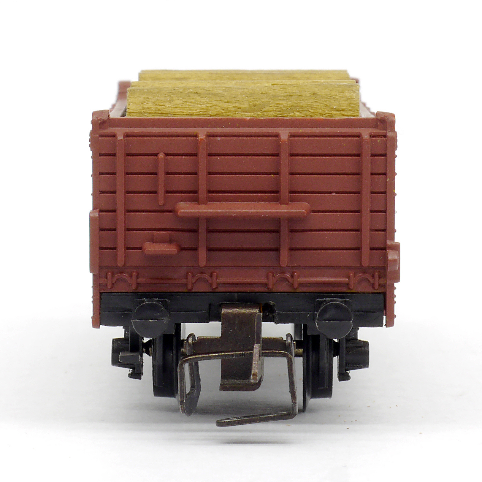 | otevřený nákladní vůz červenohnědý s nákladem kulatiny |
