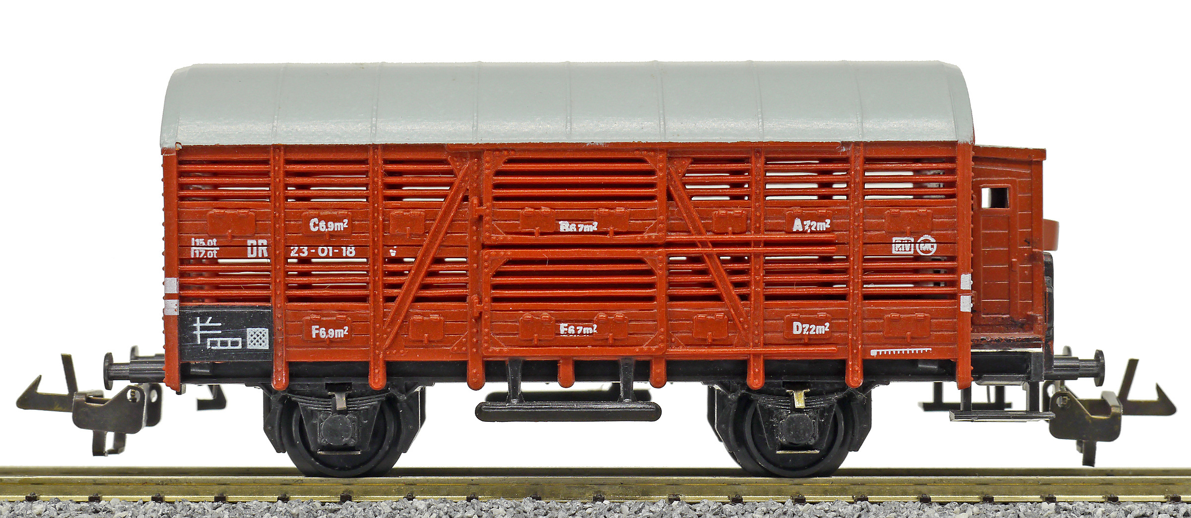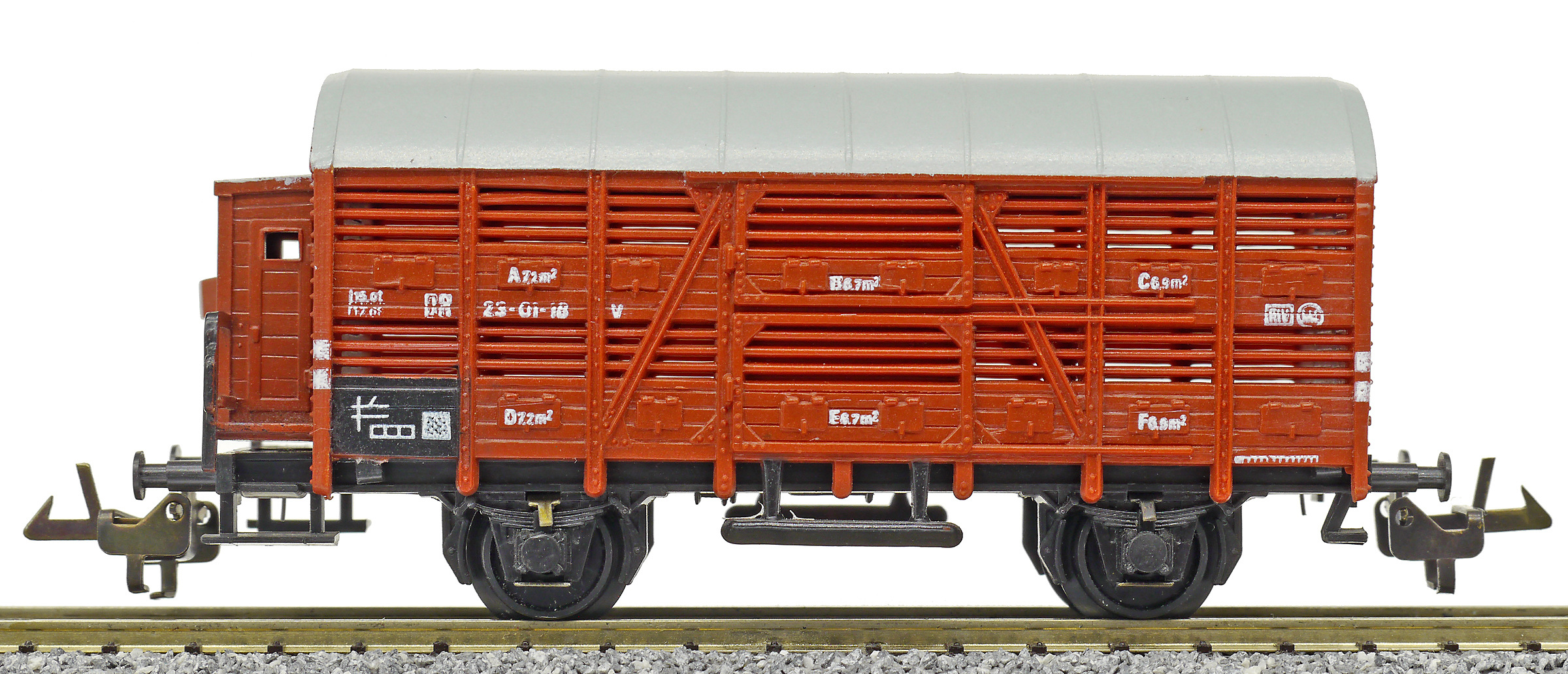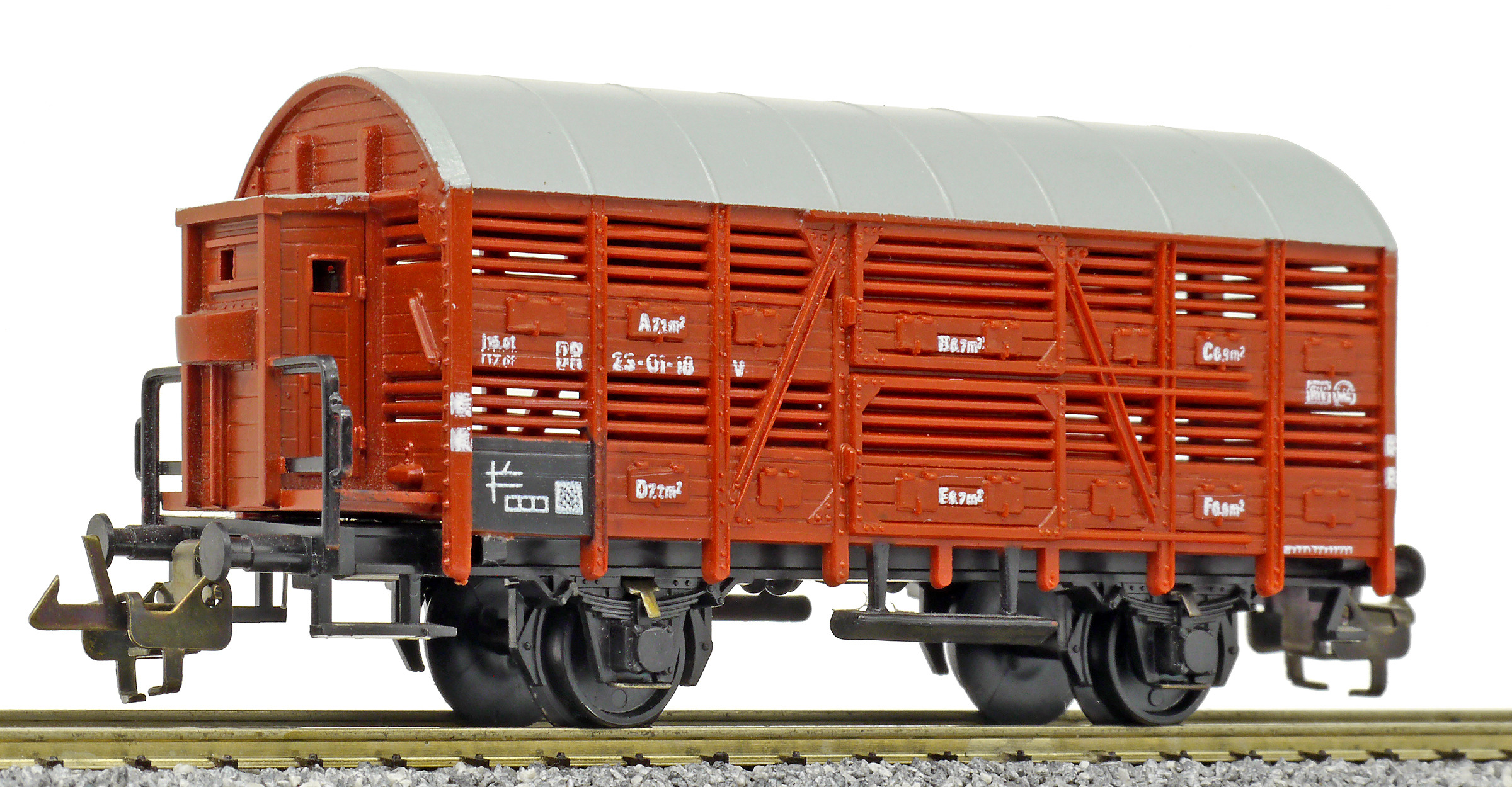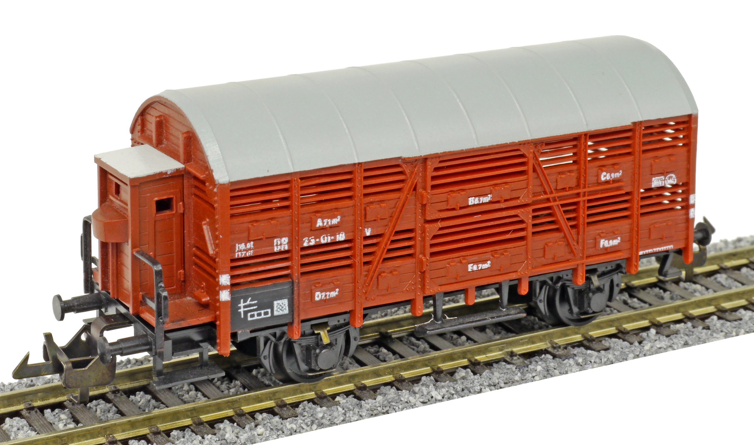| nákladní vůz na přepravu zvířat červenohnědý s šedou střechou a s brzdařskou budkou |