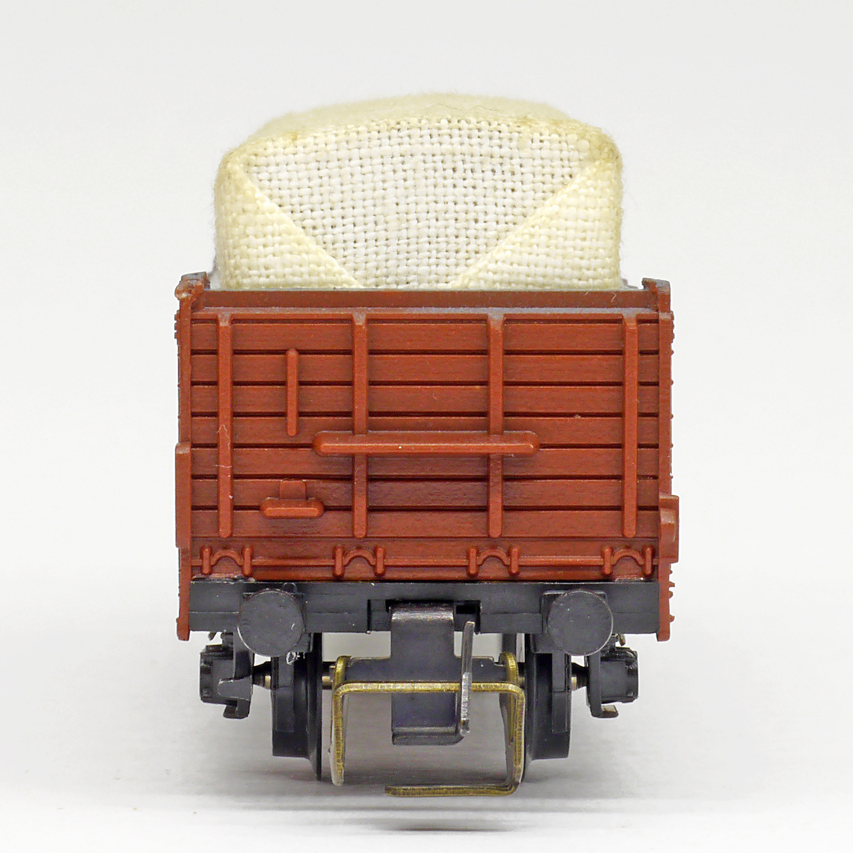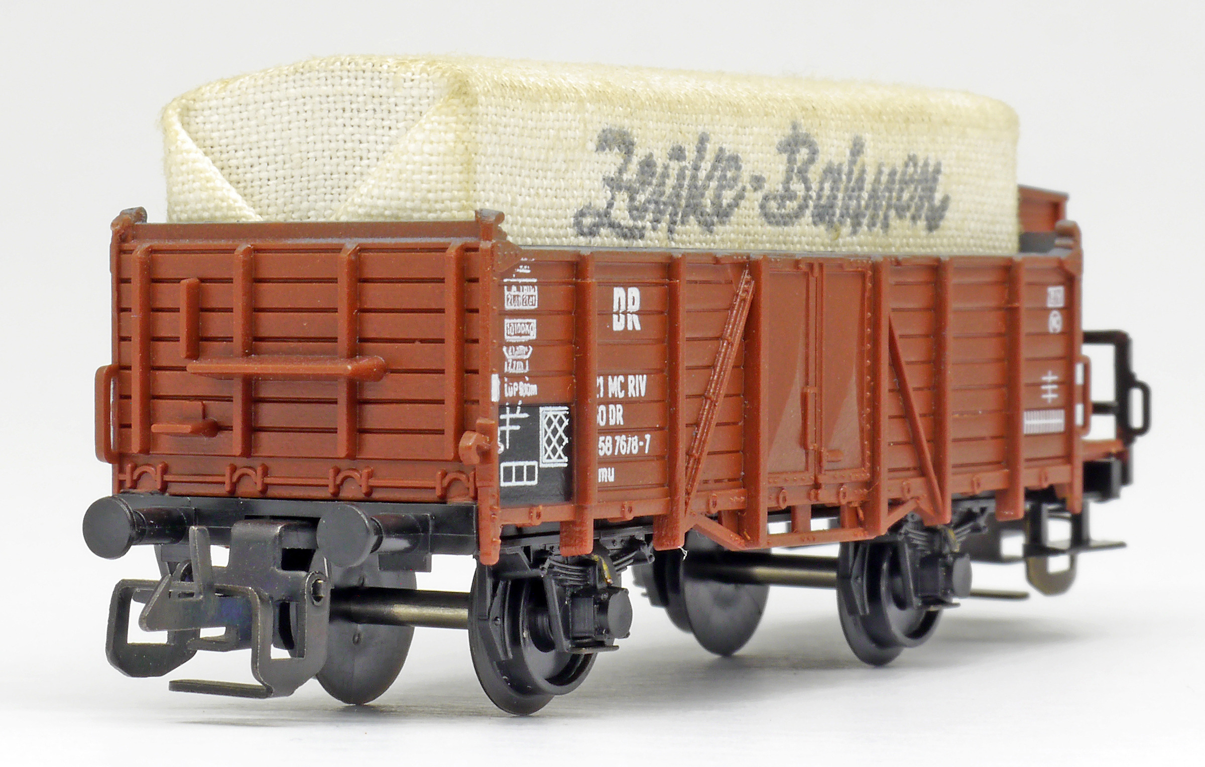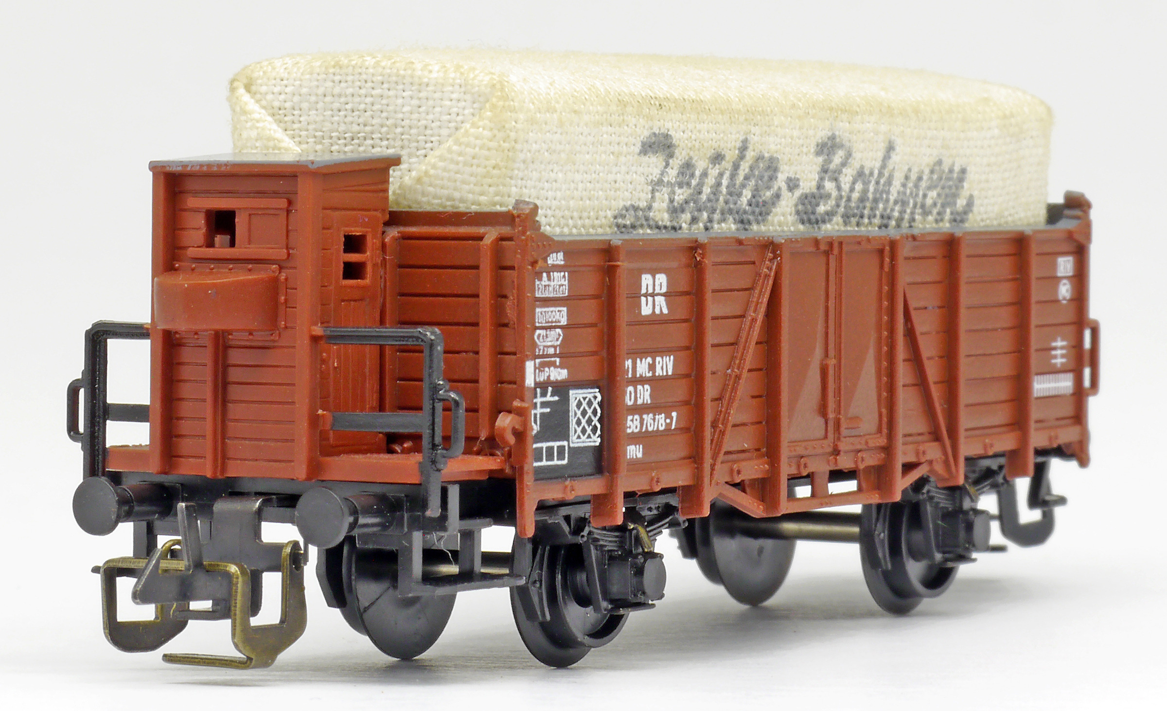 | otevřený nákladní vůz červenohnědý s brzdařskou budkou s plachtou |