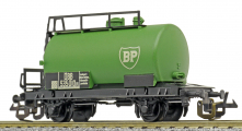 kotlový vůz zelený s černým pojezdem a s logem „BP“