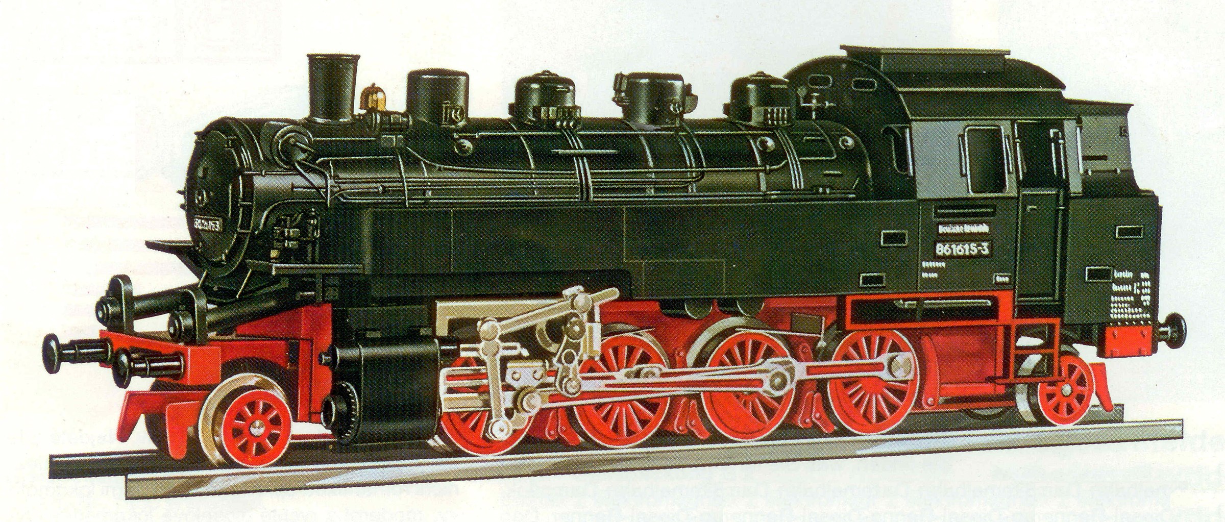 Popis   parní lokomotiva černá s červeným pojezdem