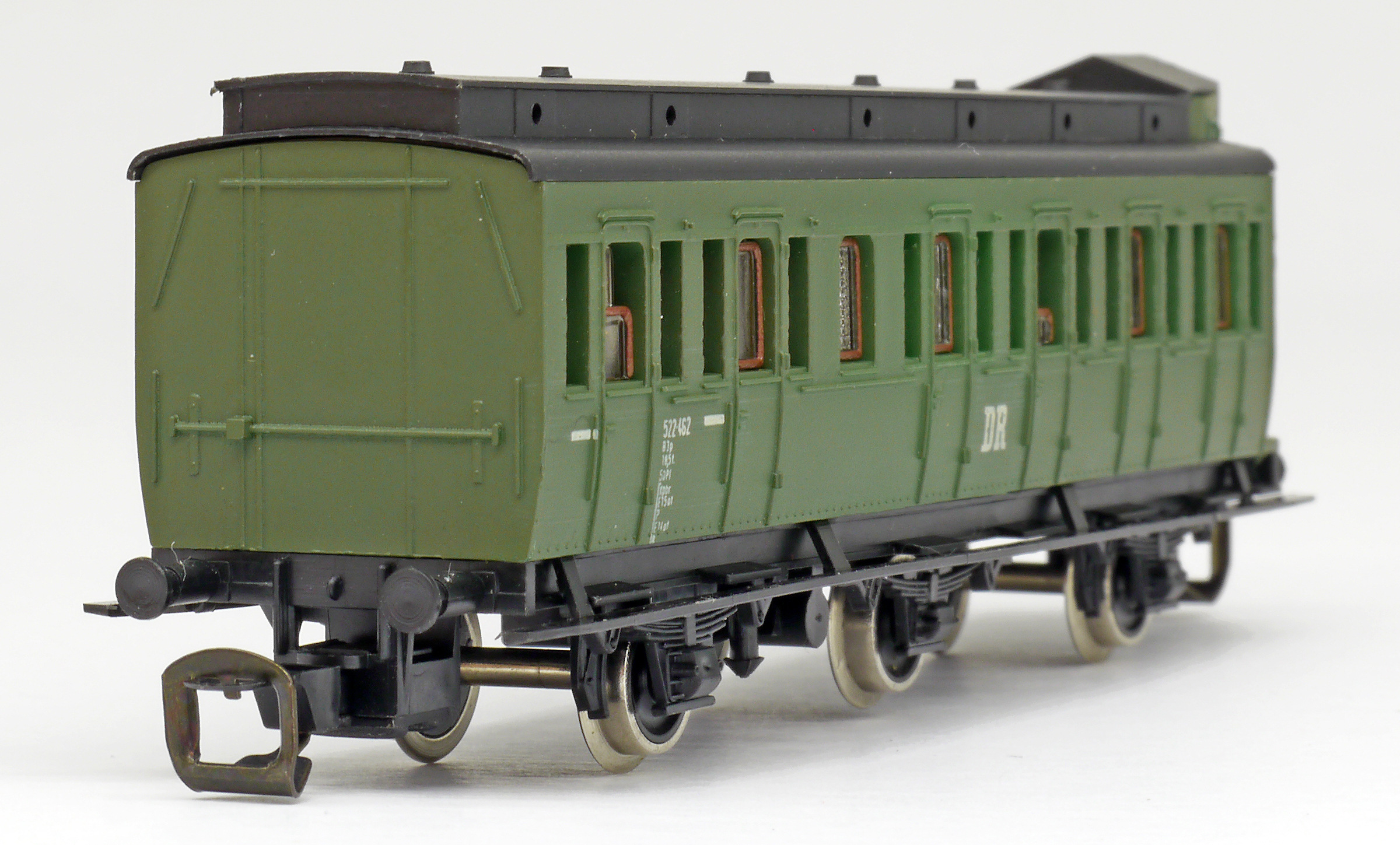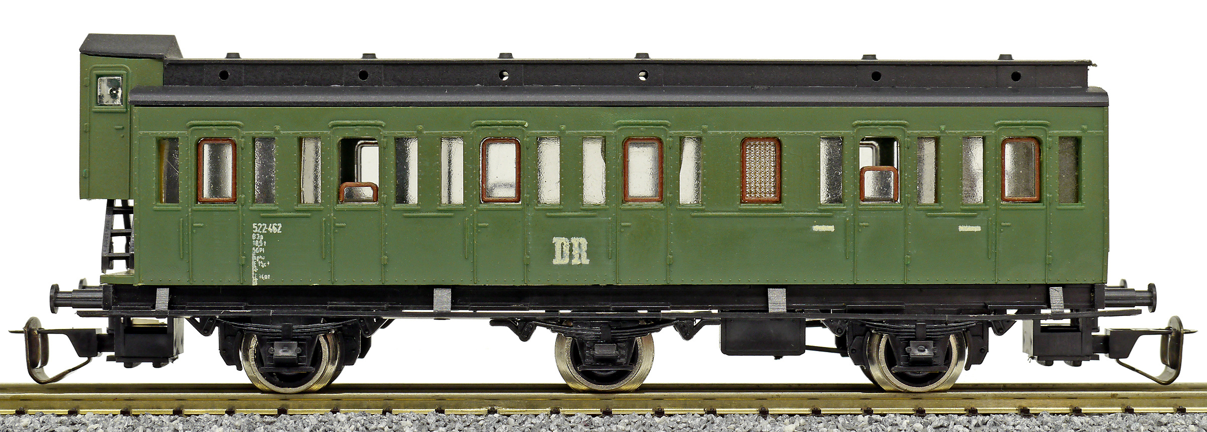 Popis   oddílový osobní vůz zelený s černou střechou a s brzdařskou budkou