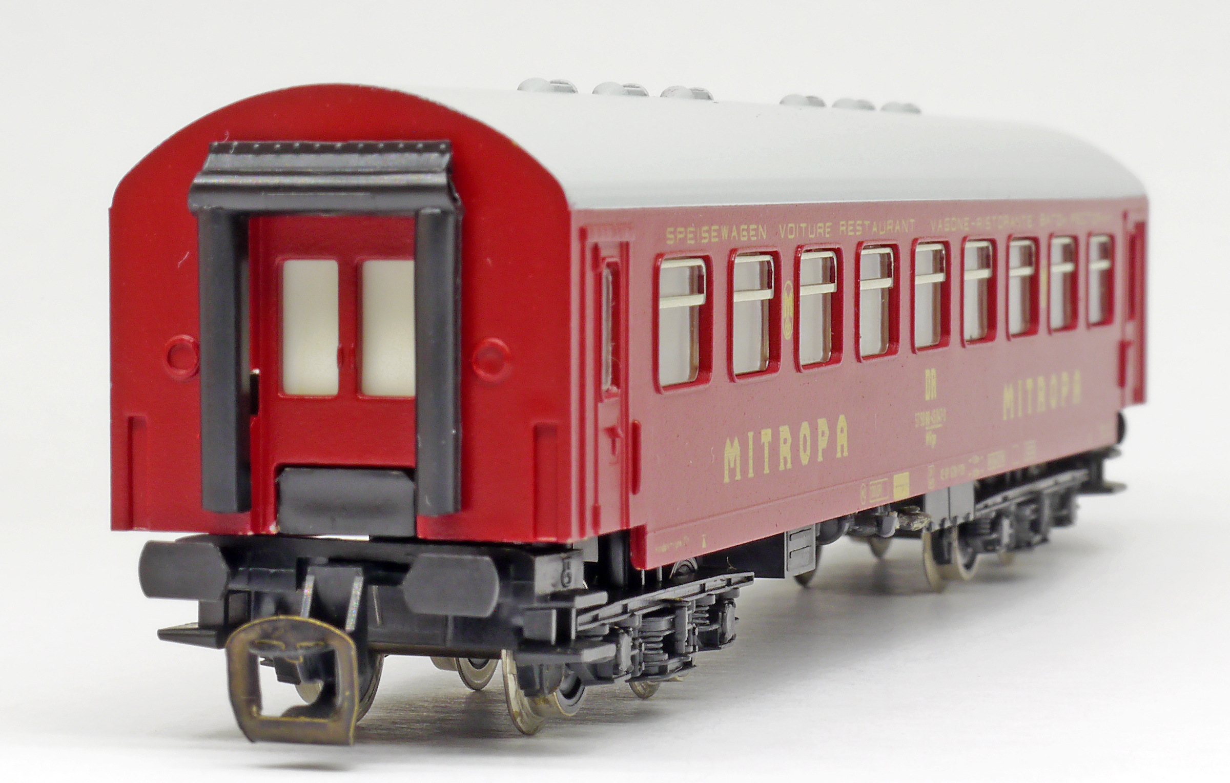 | jídelní vůz červený s šedou střechou „MITROPA“ |