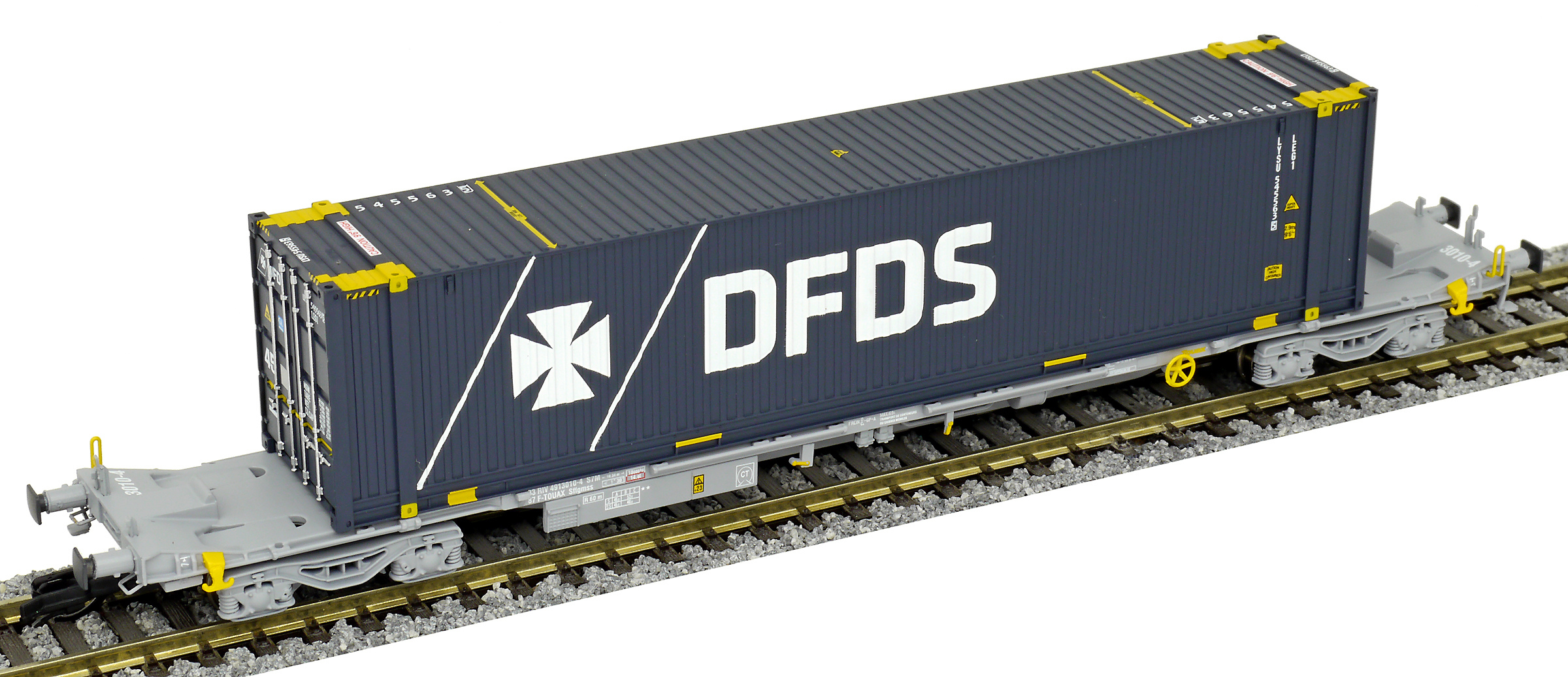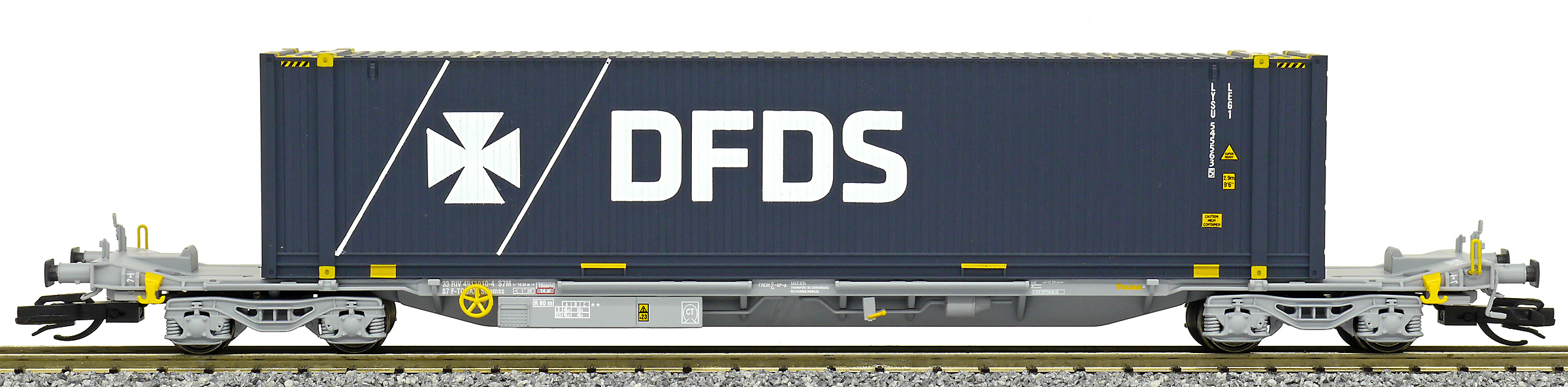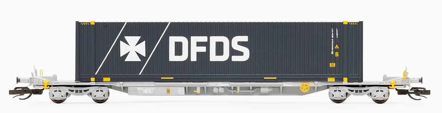 | kontejnerový vůz „IFA” šedý ložený 45' kontejnerem „DFDS” |