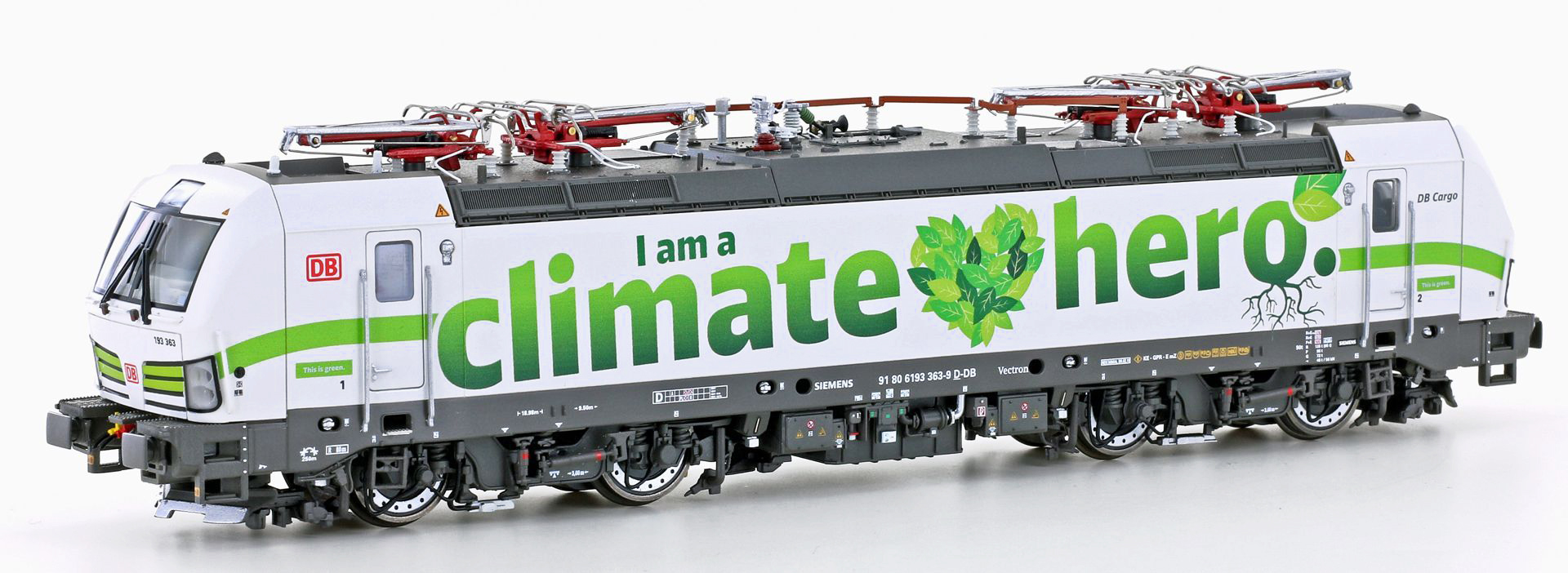 | elektrická lokomotiva bílá-šedá s reklamním potiskem „I am a Climate Hero“ |