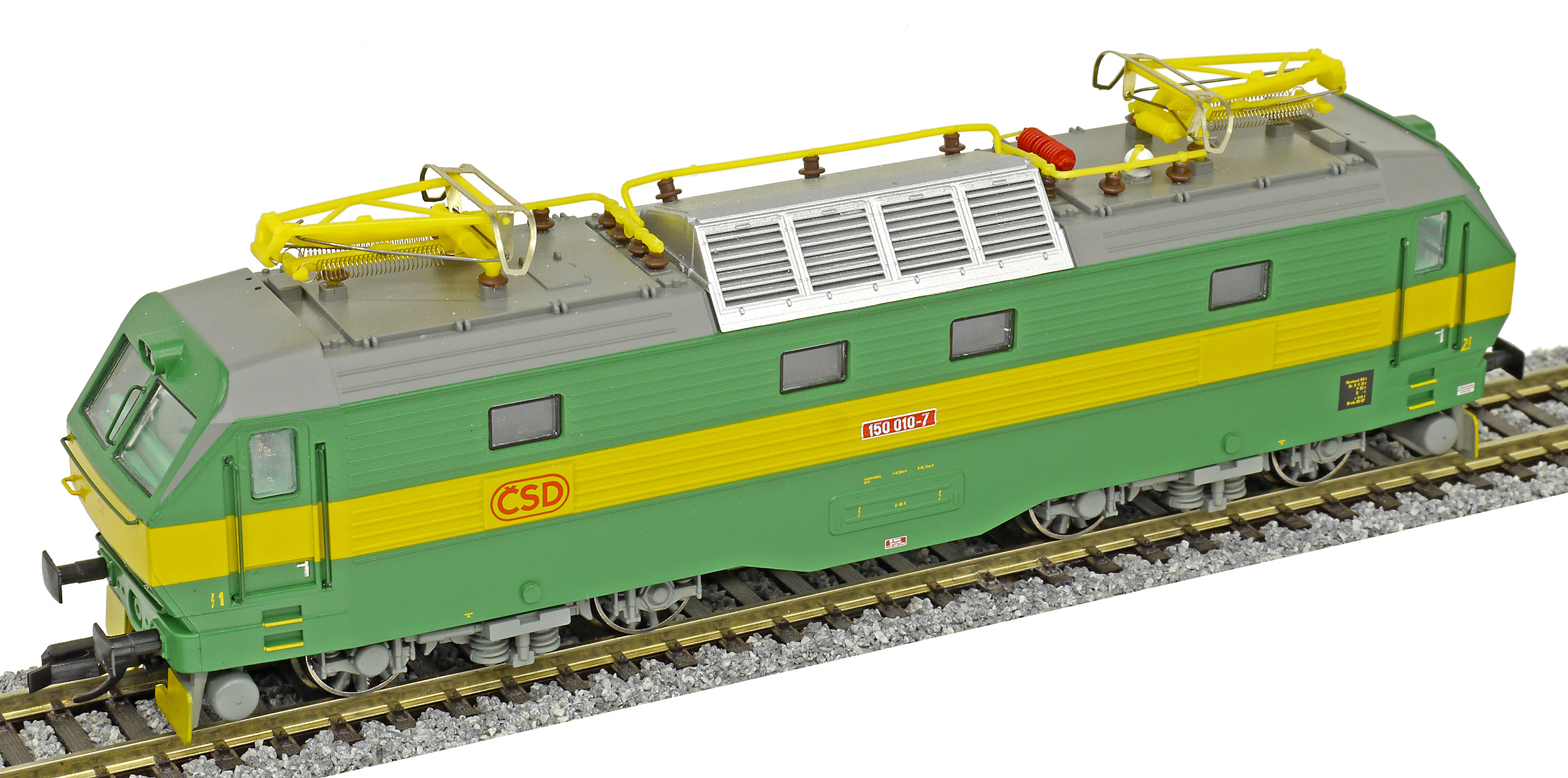 | elektrická lokomotiva zelená se žlutým výstražným pruhem |