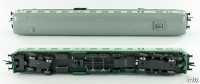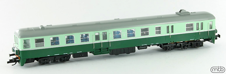 | motorový vůz zelený-tyrkysový s šedou střechou, výstražný pruh na čelech |