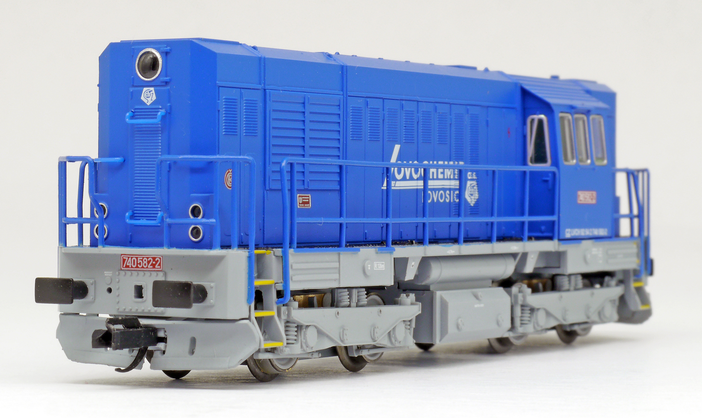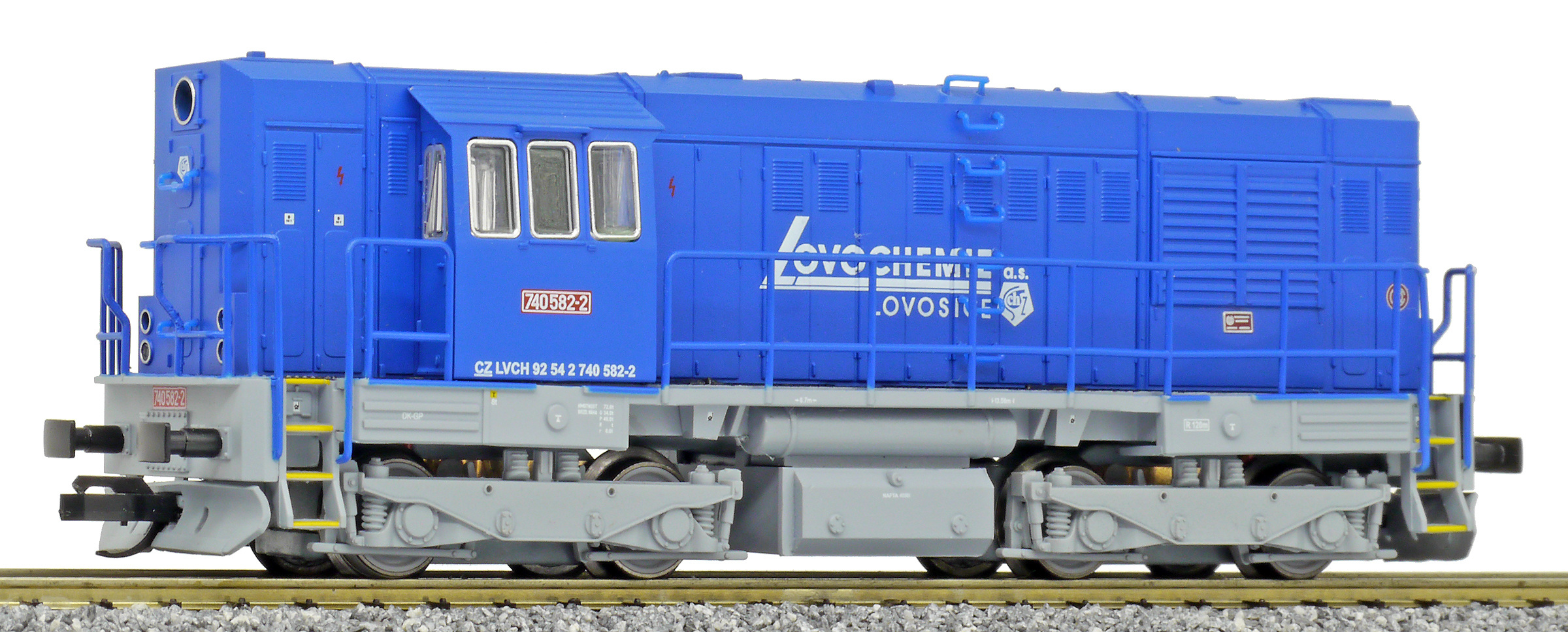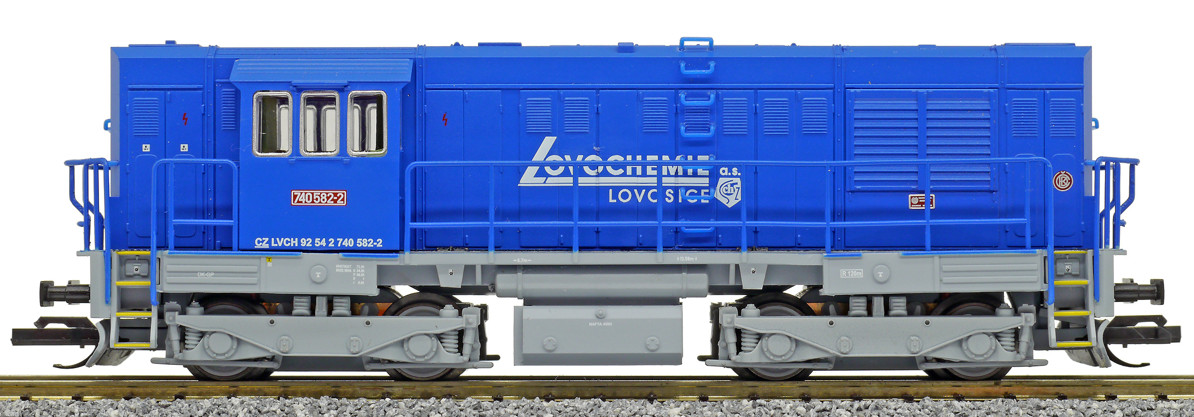 | dieselová lokomotiva modrá s šedým rámem a pojezdem „Lovochemie“ |