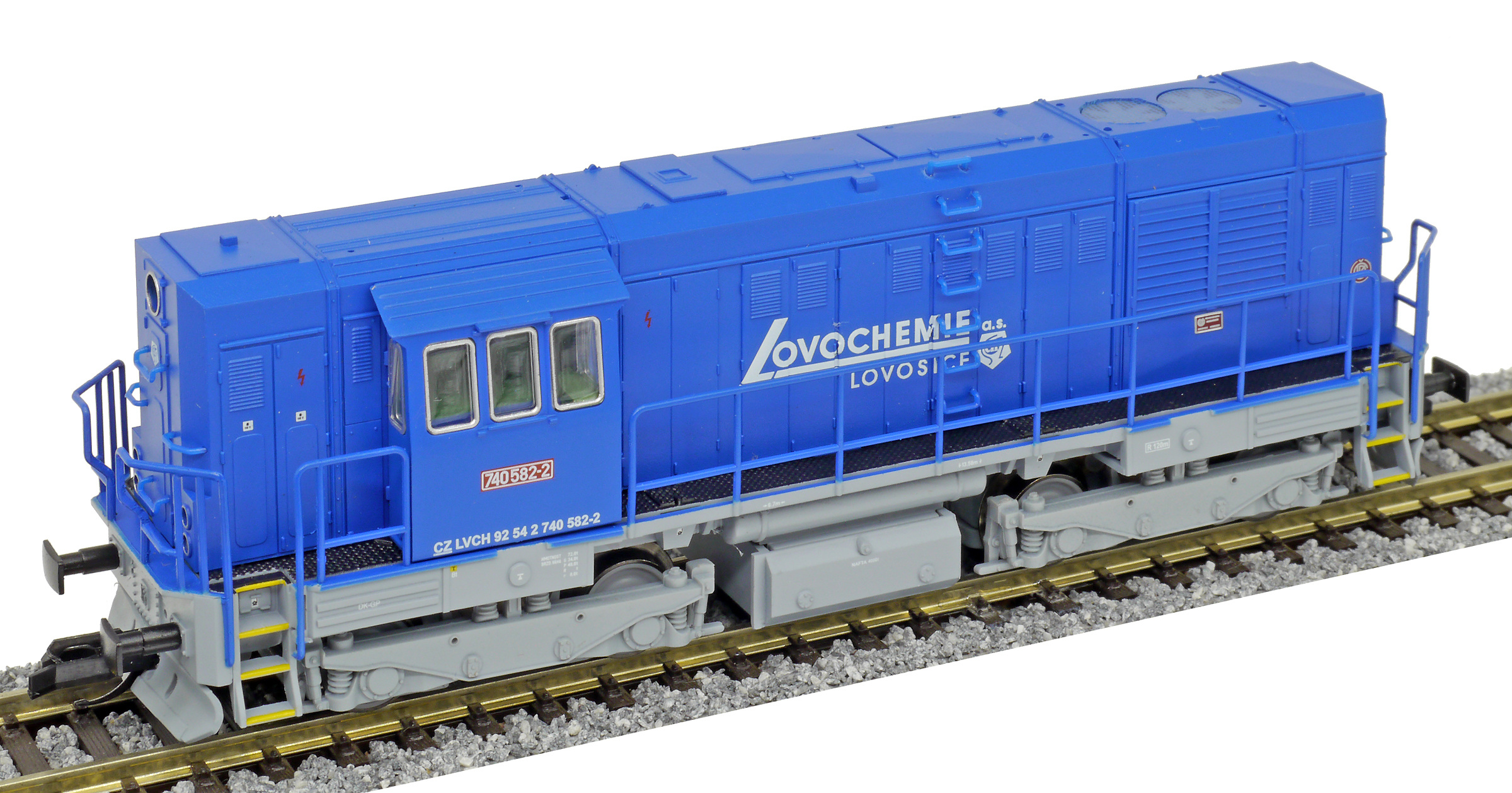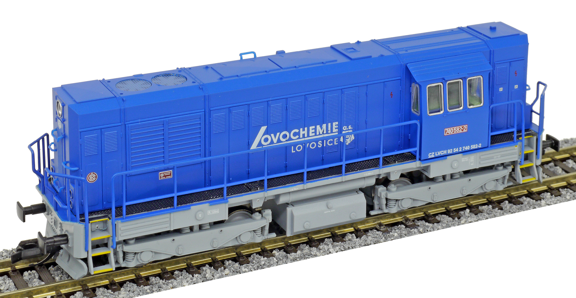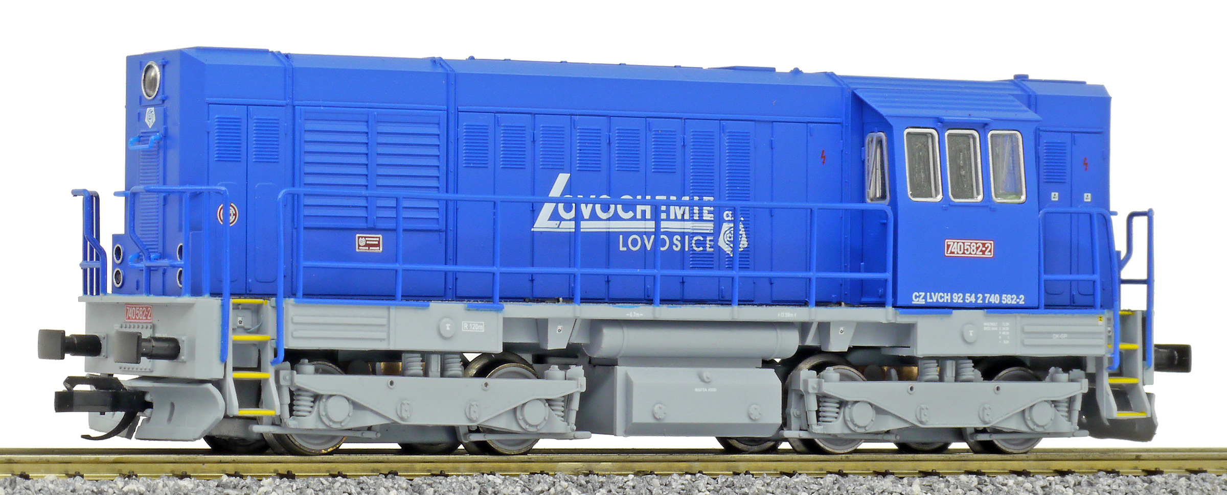 | dieselová lokomotiva modrá s šedým rámem a pojezdem „Lovochemie“ |