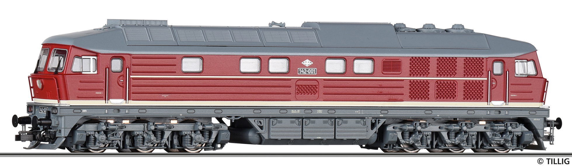 | dieselová lokomotiva červená s proužkem, šedá střecha, černý rám a pojezd |