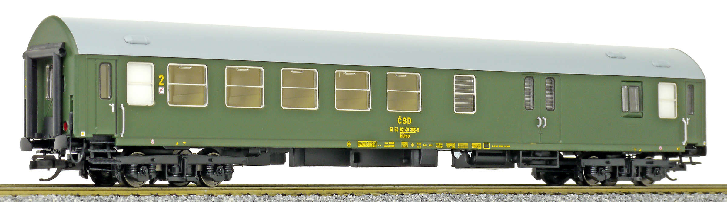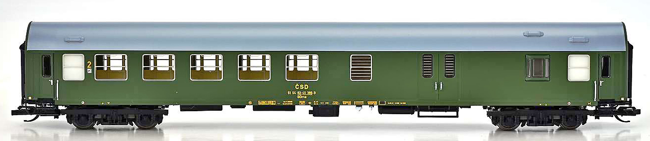 | rychlíkový vůz zelený s šedou střechou 2. tř. a zavazadlovým oddílem |