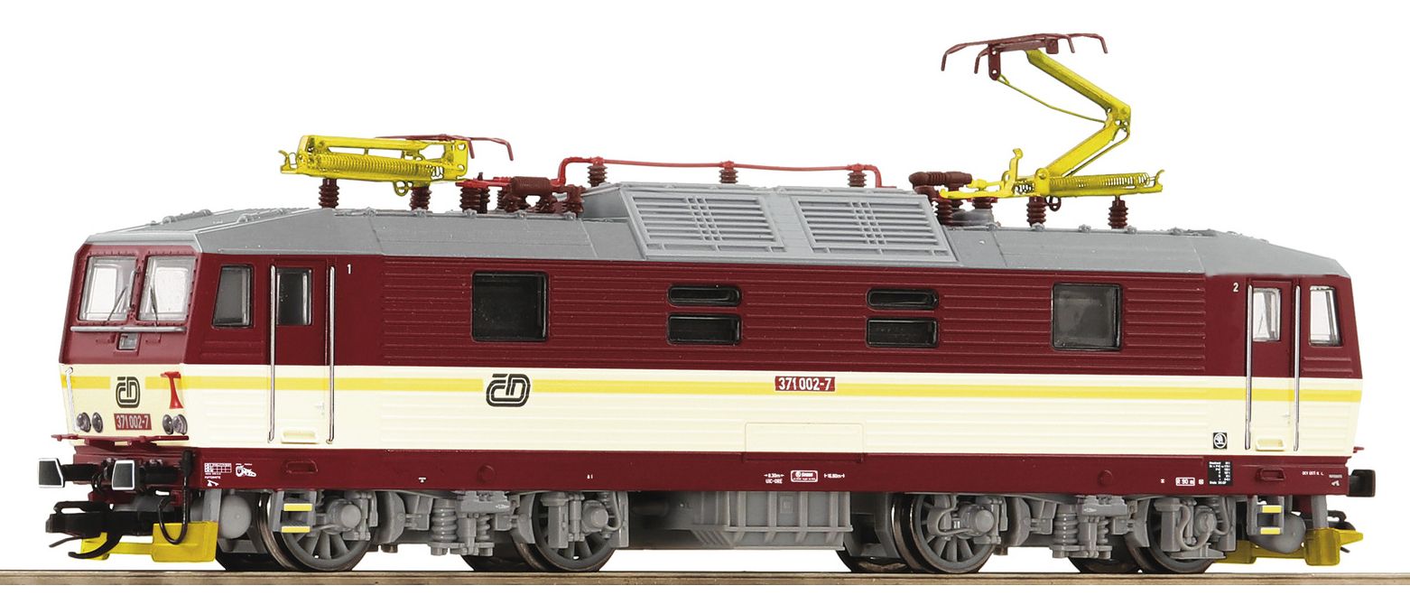 | elektrická lokomotiva červená-slonová kost, šedá střecha a žluté polopantografy |