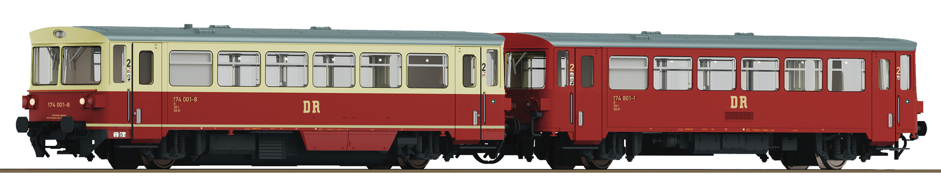 | motorový vůz v barvě červený-slonová kost s šedou střechou s přípojným vozem v červené barvě s šedou střechou |
