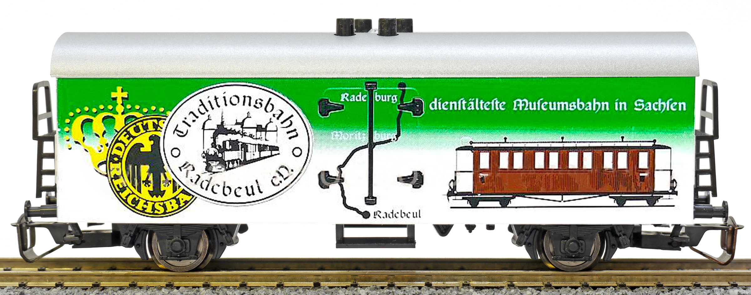 Popis   nákladní chladící vůz bílý se stříbrnou střechou a s reklamním potiskem „Traditionsbahn Radebeul“