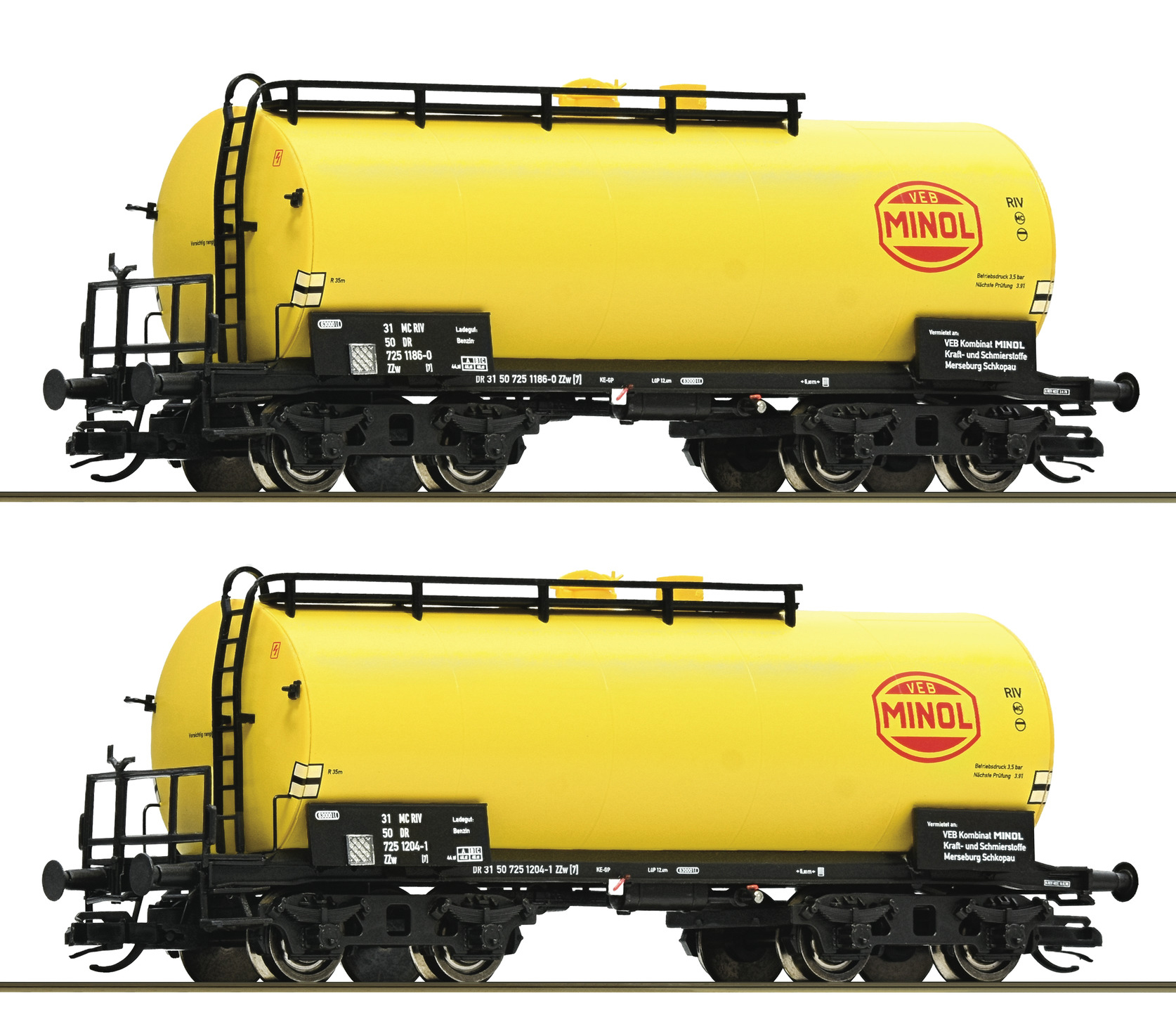 | set dvou žlutých kotlových vozů s podélnou lávkou s logem „MINOL“ |
