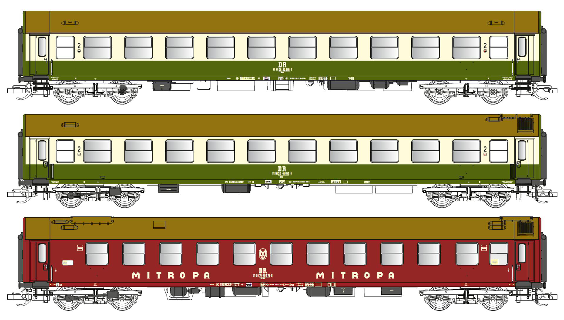 | lůžkový vůz vínově červený (RAL 3003) s hnědou (RAL 8000) střechou „MITROPA“ |