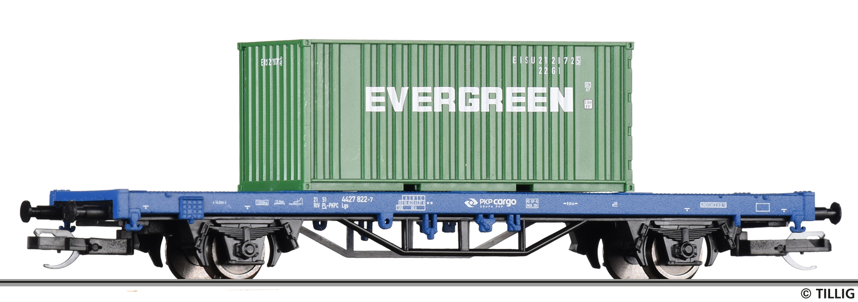 | plošinový vůz modrý s nákladem 1x 20' kontejneru „EVERGREEN“ |