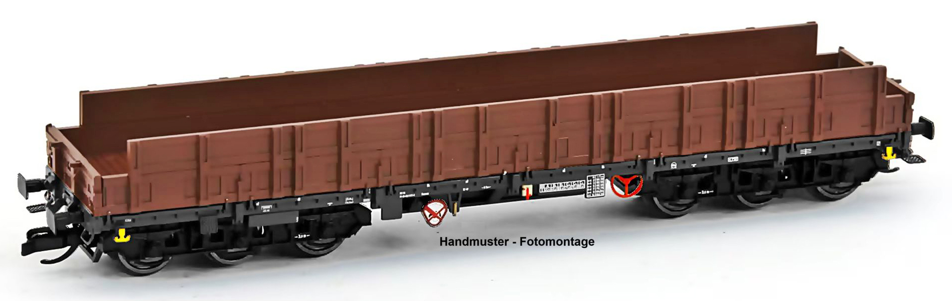 | plošinový nákladní vůz s vysokými bočními stěnami hnědý, černé rám a podvozky |
