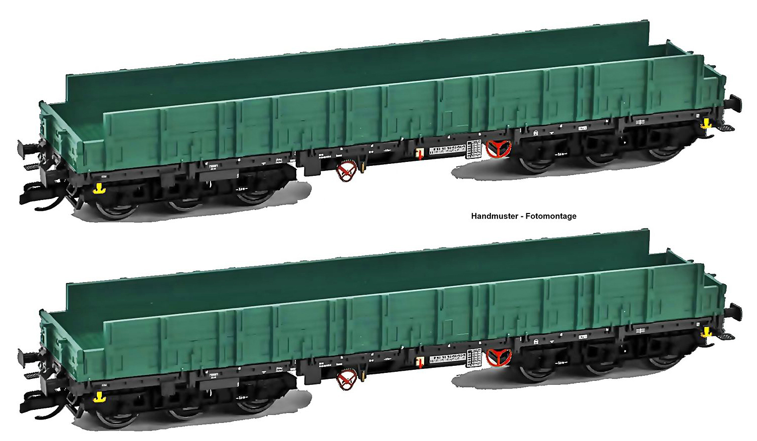 | set dvou plošinových nákladních vozů s vysokými bočnicemi, zelené, černý rám a podvozky |