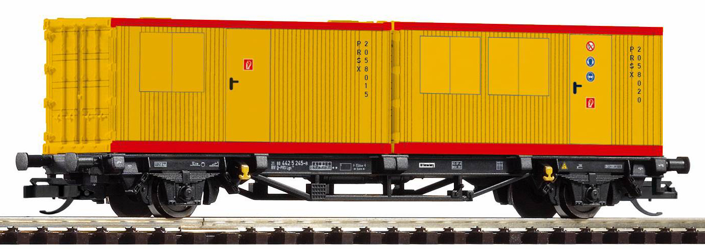 | plošinový vůz černý s nákladem 2x20' kontejnerů „PRSX“ |