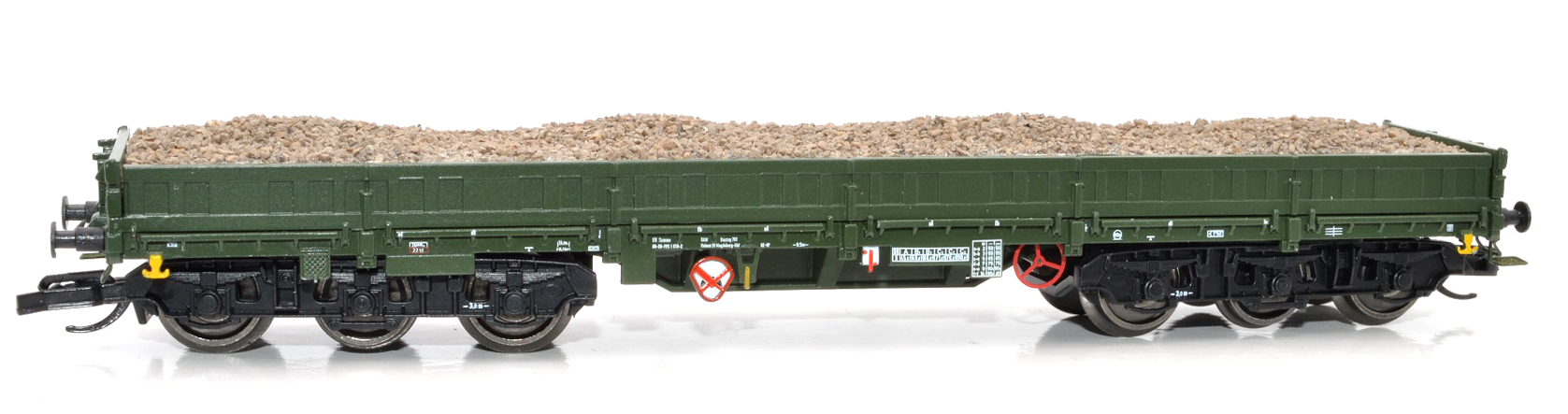 | nízkostěnný nákladní vůz zelený do pracovního vlaku s nákladem písku |