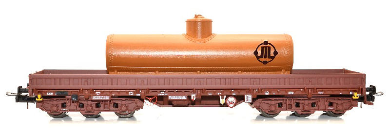 | nízkostěnný nákladní vůz červenohnědý s nákladem kotle na odpadní olej |