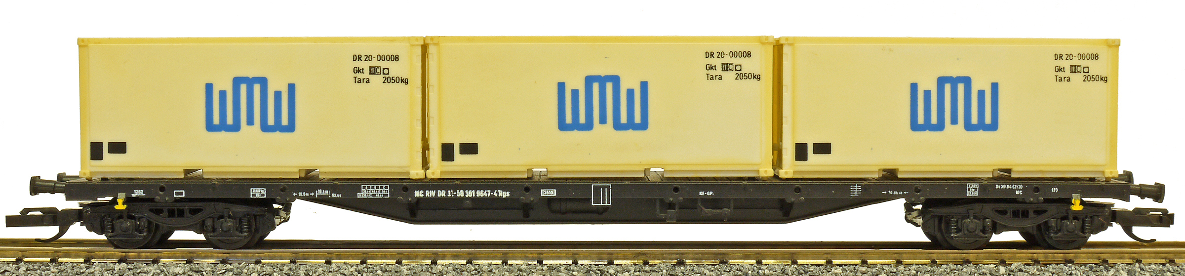 | nákladní plošinový vůz černý se třemi kontejnery 20' „WMW“ |