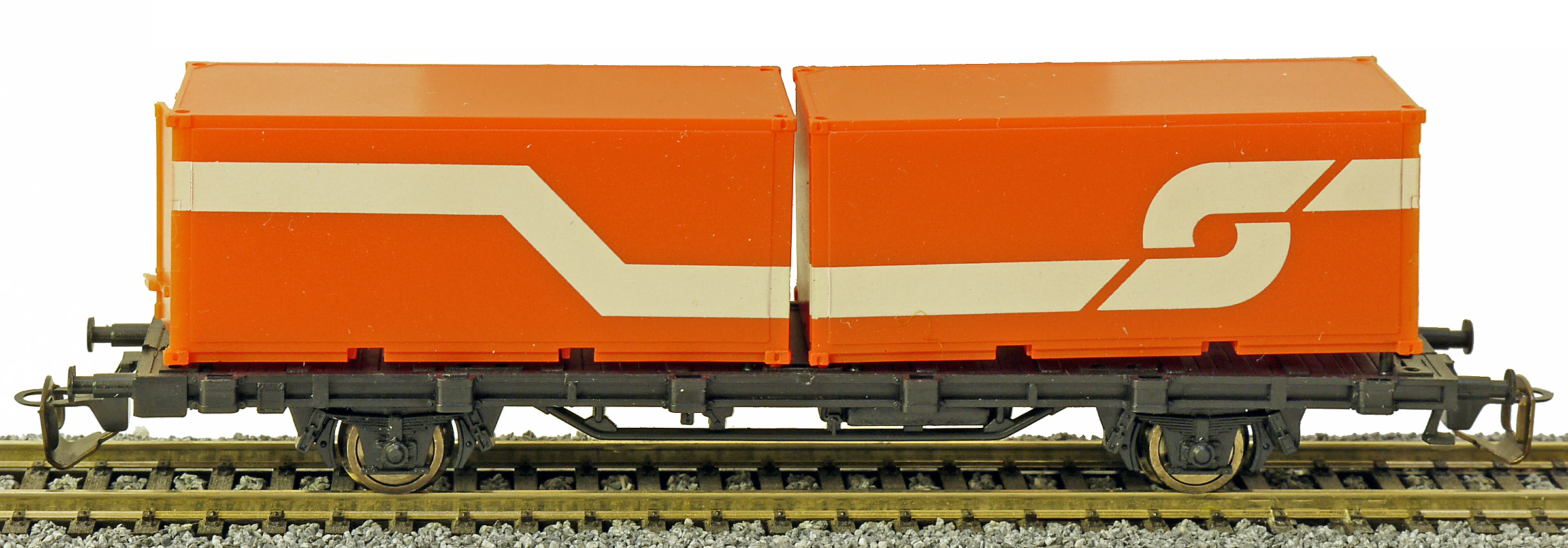 | nákladní plošinový vůz černý se dvěma 20' kontejnery „ÖBB“ |
