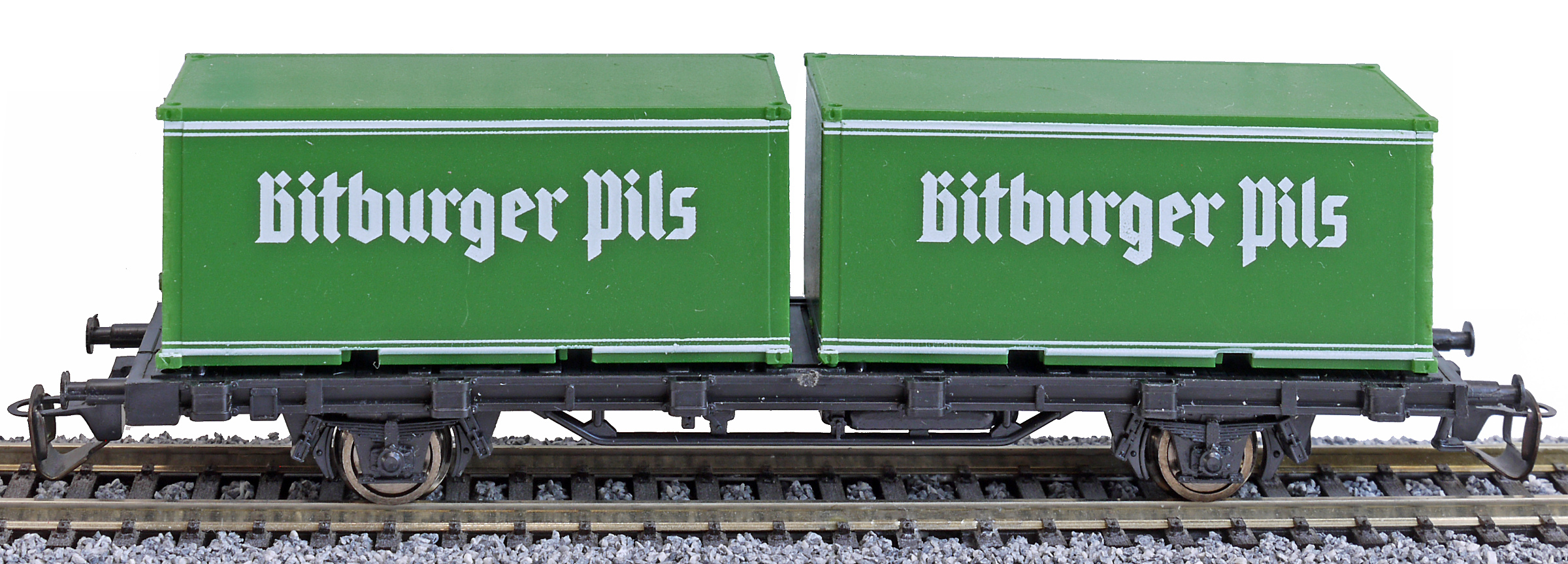 | nákladní plošinový vůz černý se dvěma 20' kontejnery „Bitburger Pils“ |
