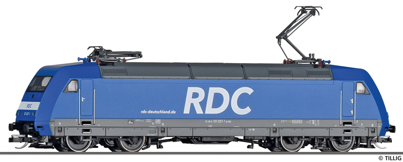 | elektrická lokomotiva modrá, šedá střecha a rám, s logem „RDC“ |