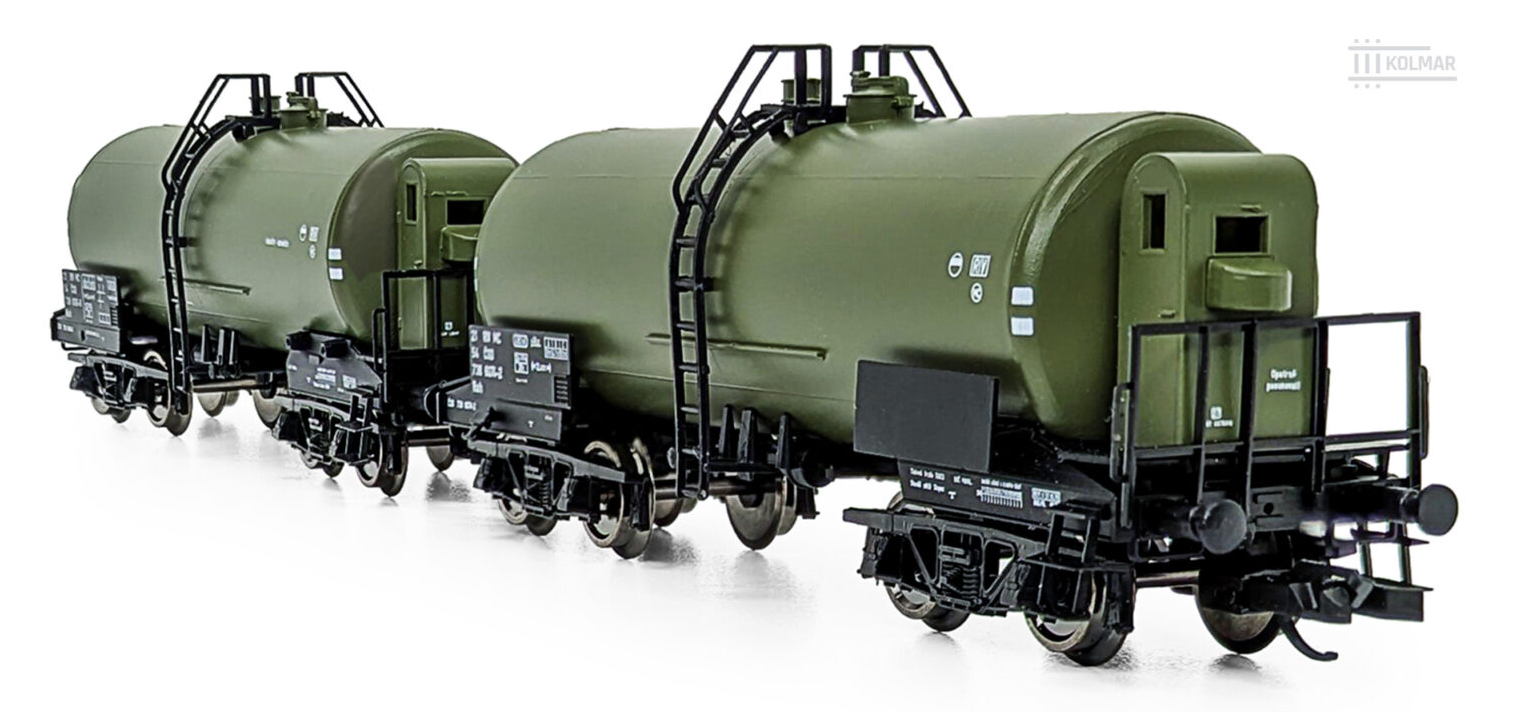 | set tří zelených kotlových vozů s brzdařskými budkami |