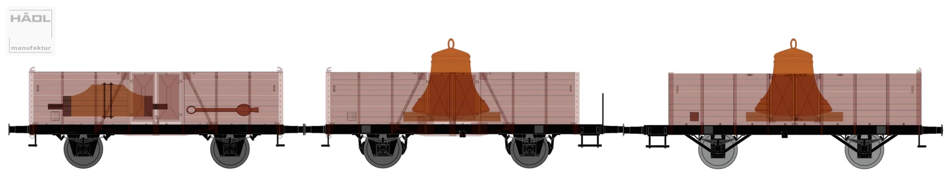 | set tří otevřených nákladních vozů s nákladem 2 zvonů a příslušenství |