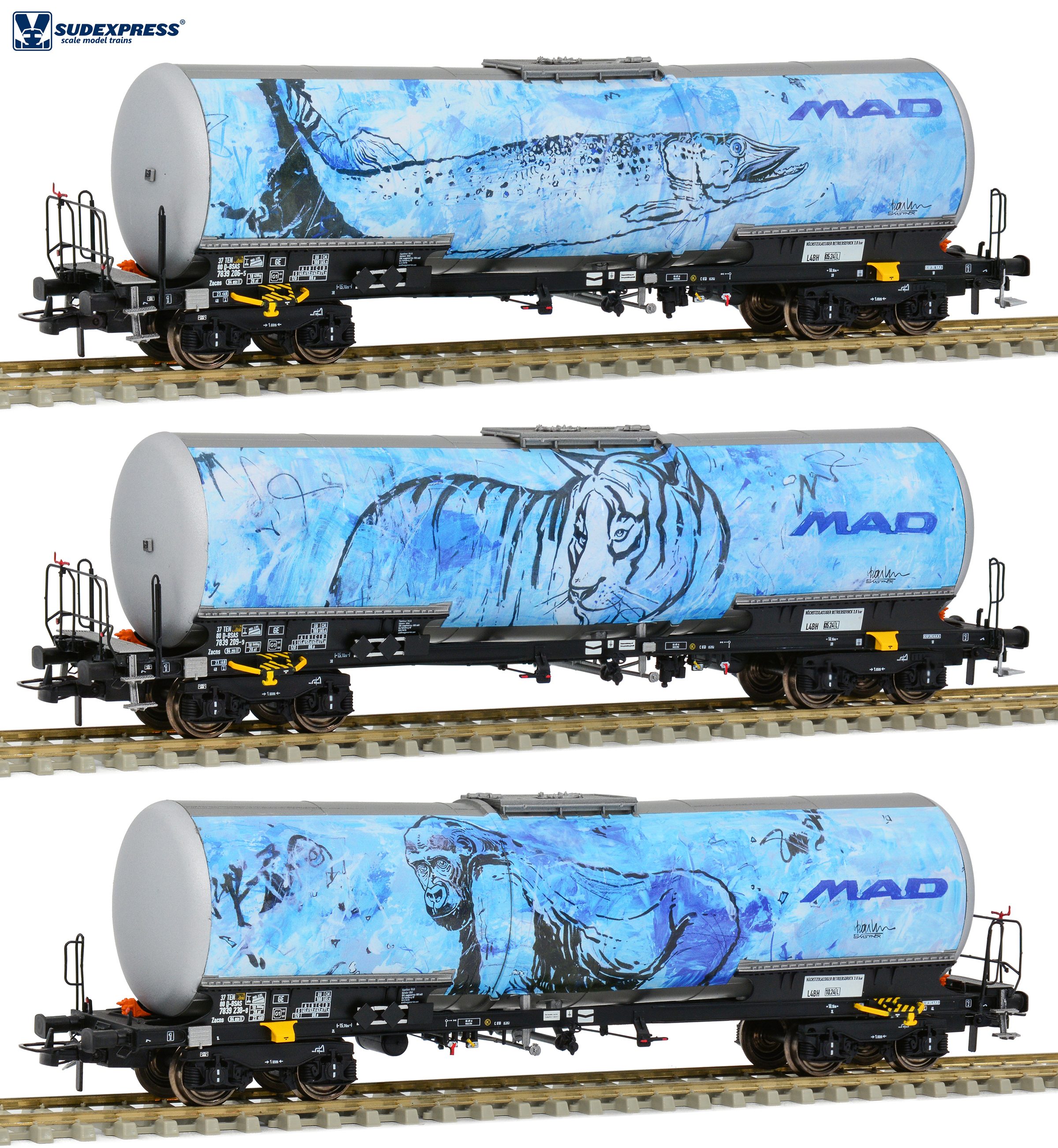 set tří šedých kotlových vozů s potiskem motivů zvířat