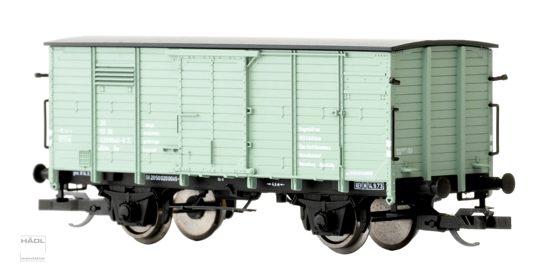 | krytý nákladní vůz světle tyrkysový s šedou střechou pro přepravu kyslíku „VEB Elbe Werft Boizenburg“ |