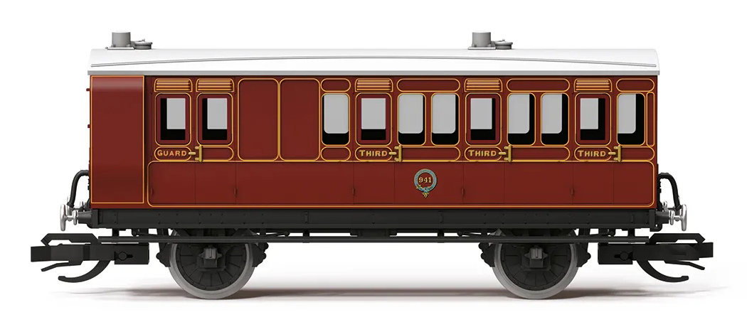 | osobní vůz tmavě červený se světle šedou střechou „Brake Third Class Coach“ |