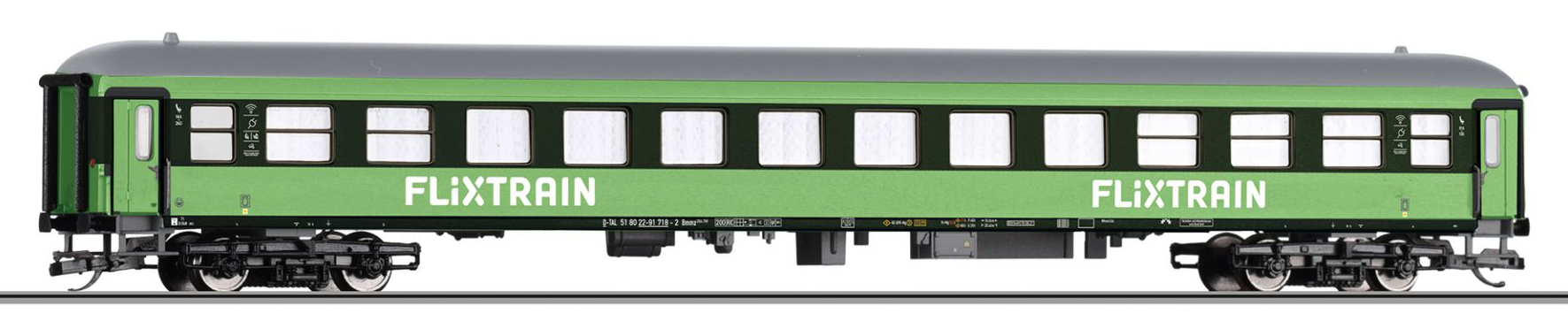 | rychlíkový vůz v barevném schematu „Flixtrain“ |
