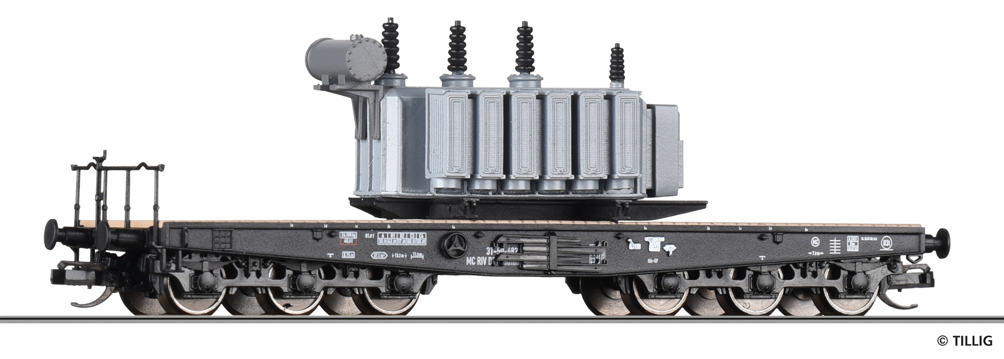 | nákladní plošinový vůz černý s klanicemi ložený transformátorem |