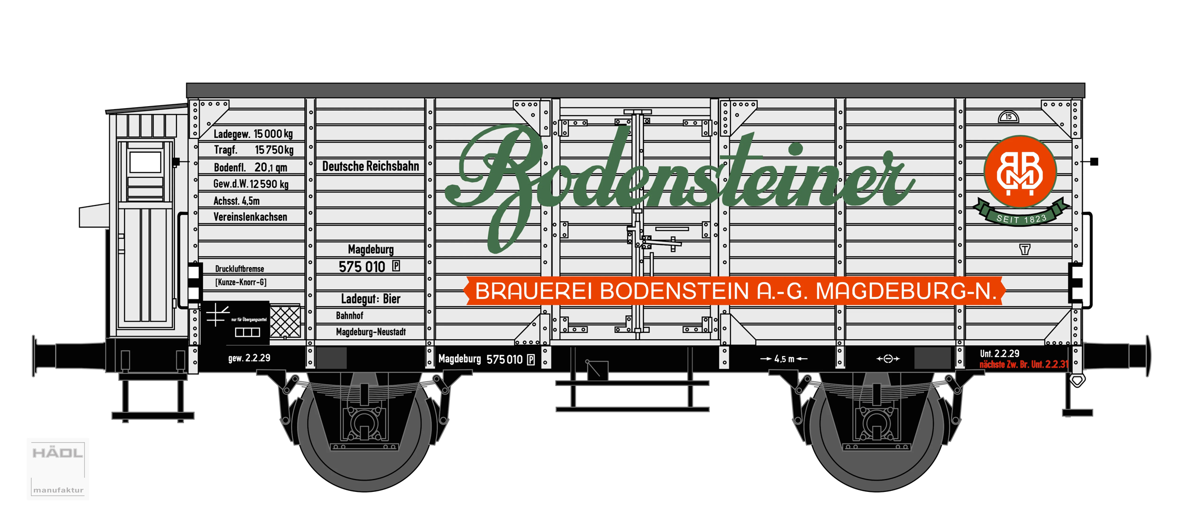 | krytý nákladní vůz bílý s šedou střechou „Brauerei Bodenstein AG Magdeburg“ |