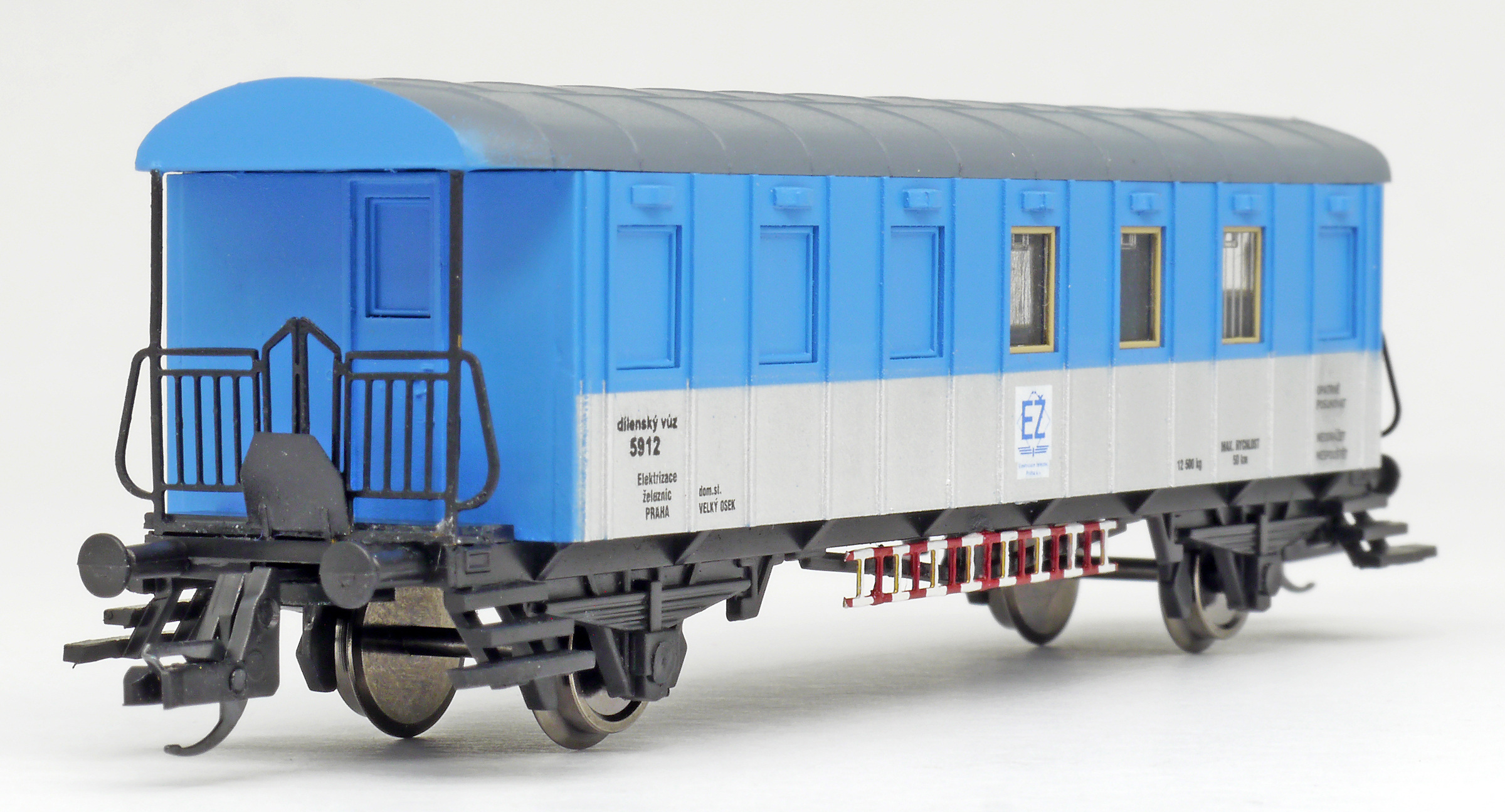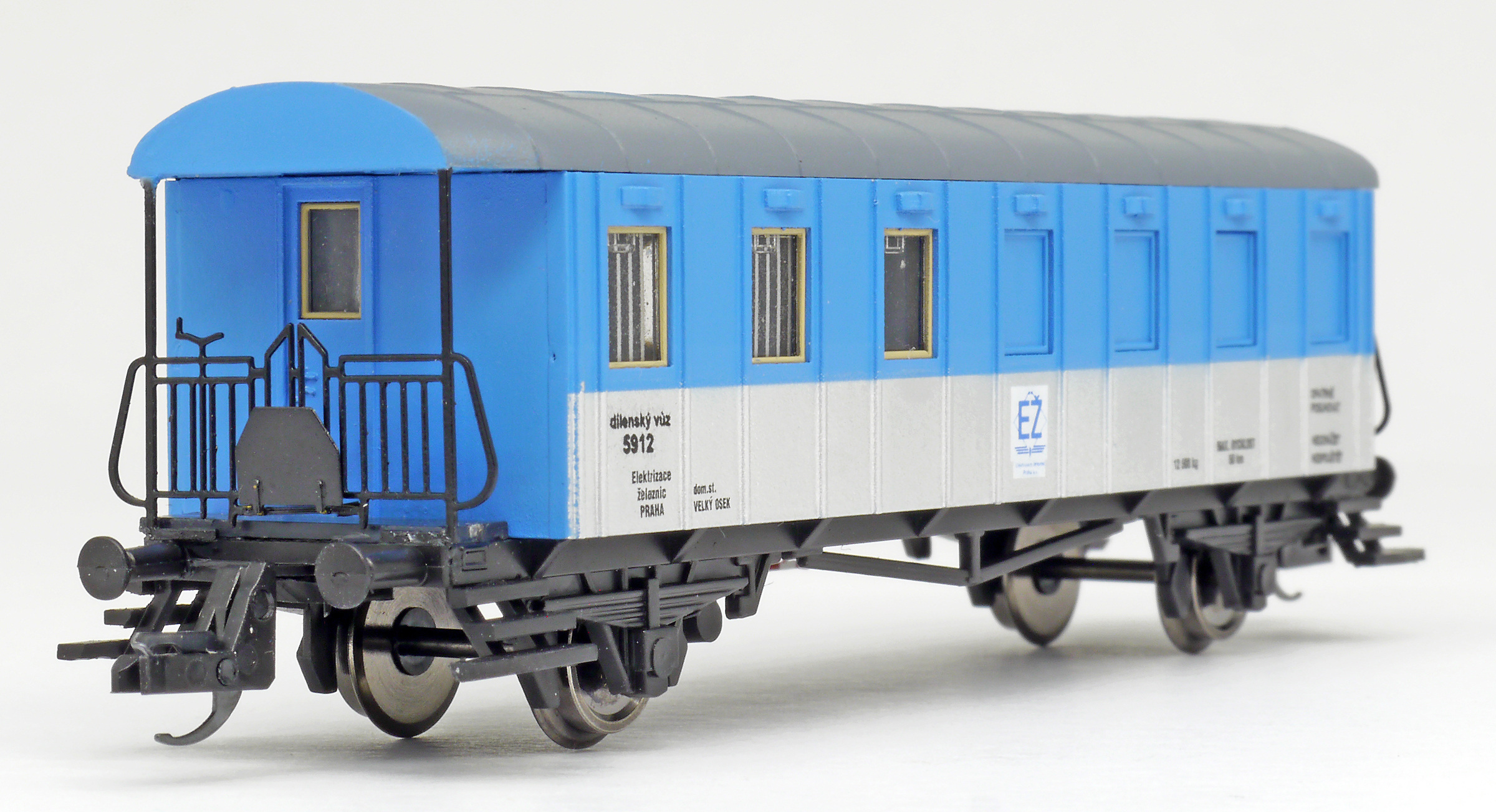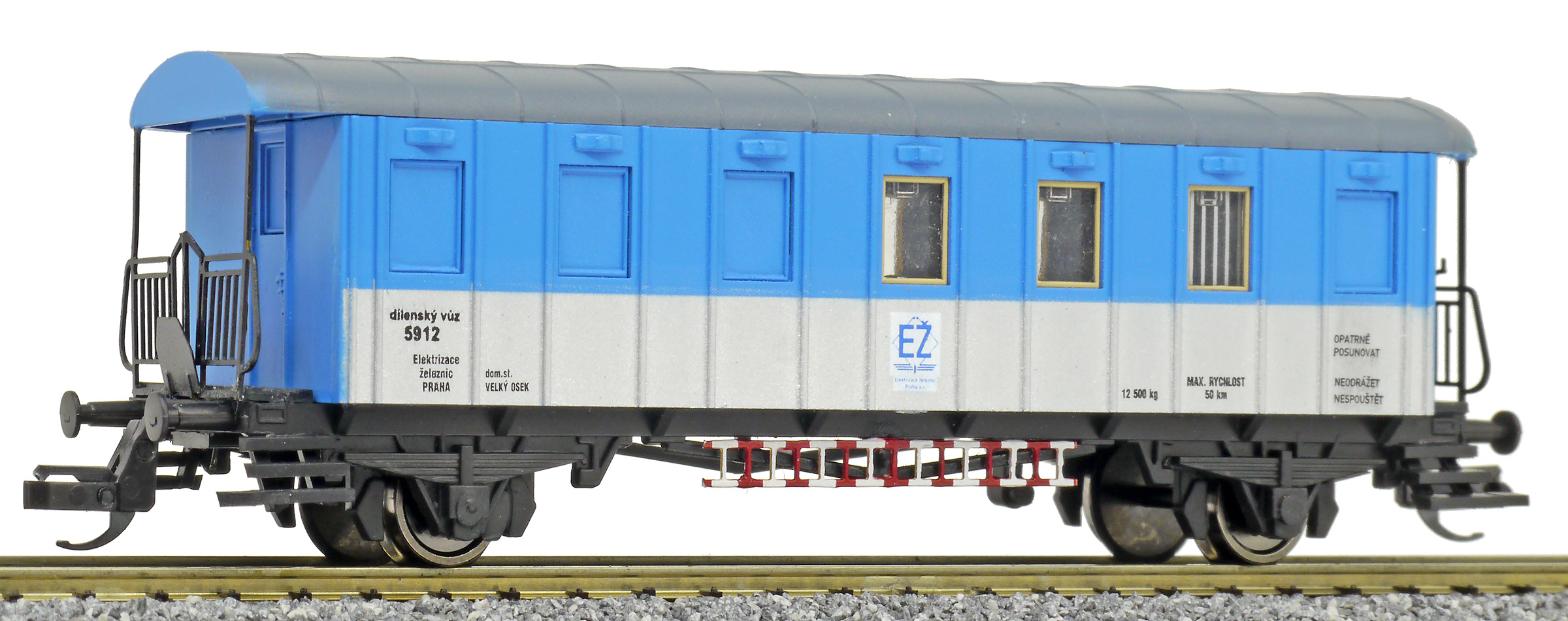 | dílenský vůz modrý-stříbrný s šedou střechou „Elektrizace železnic“ |