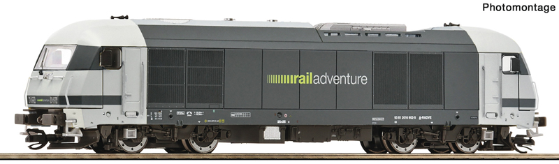 | dieselová lokomotiva v šedém barevném schematu „RailAdventure“ |